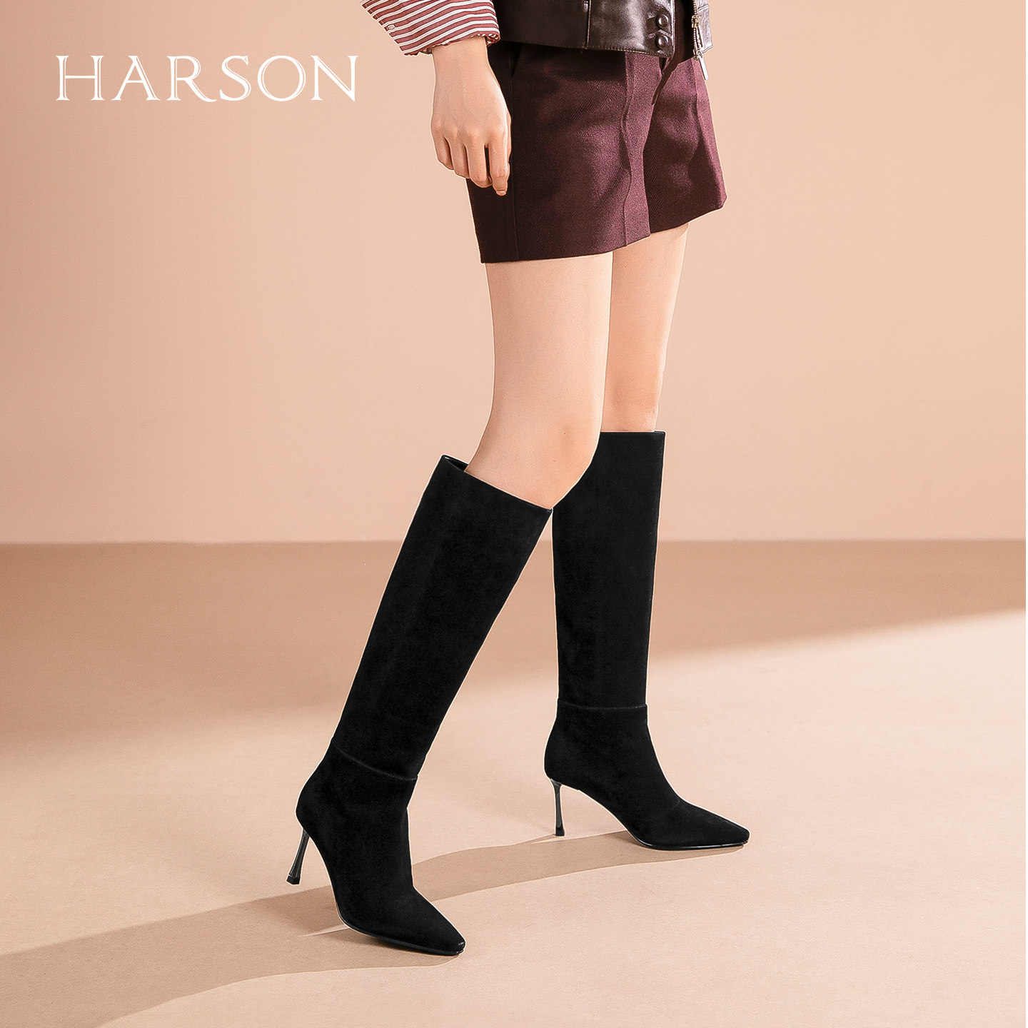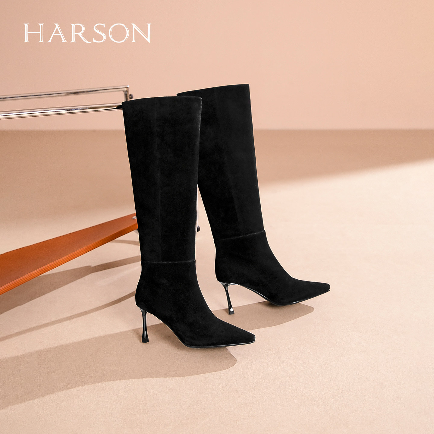 哈森优雅气质尖头高筒靴女2025秋冬新款细高跟时装靴HA257193