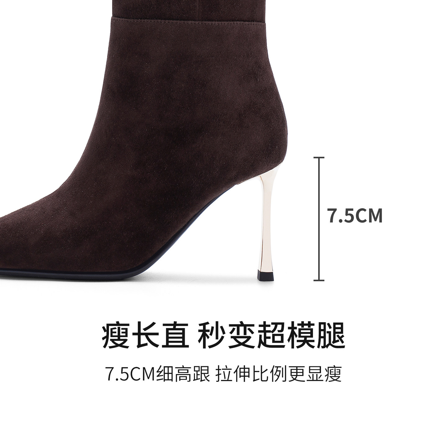 棕色靴子!小个子内增高7CM法式方头靴2025冬新款绒面粗跟短靴女