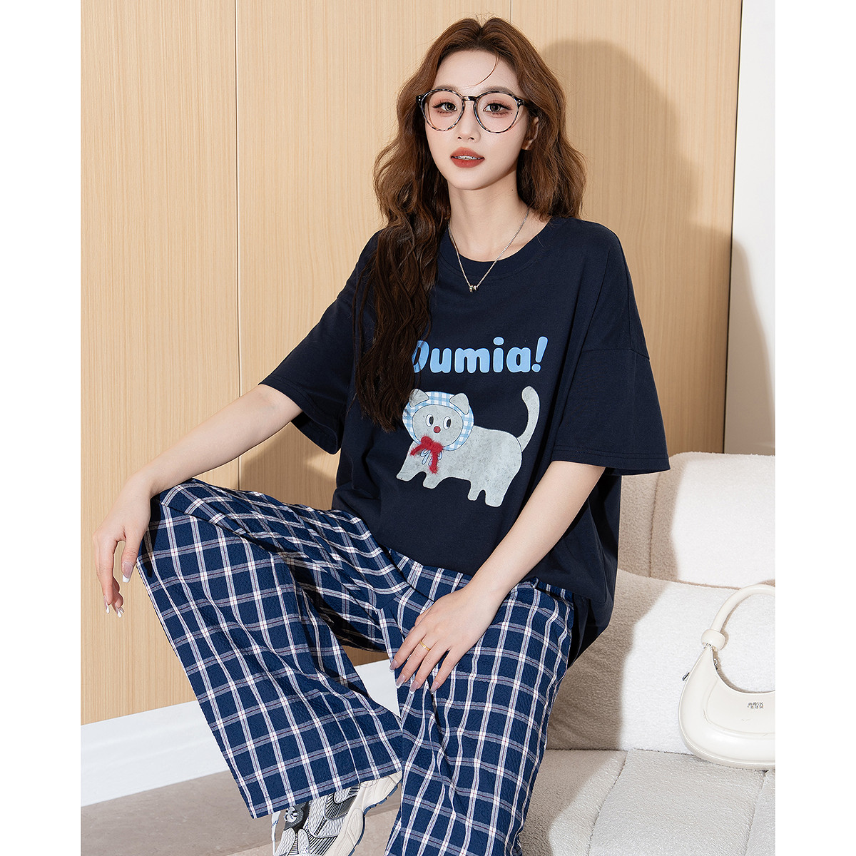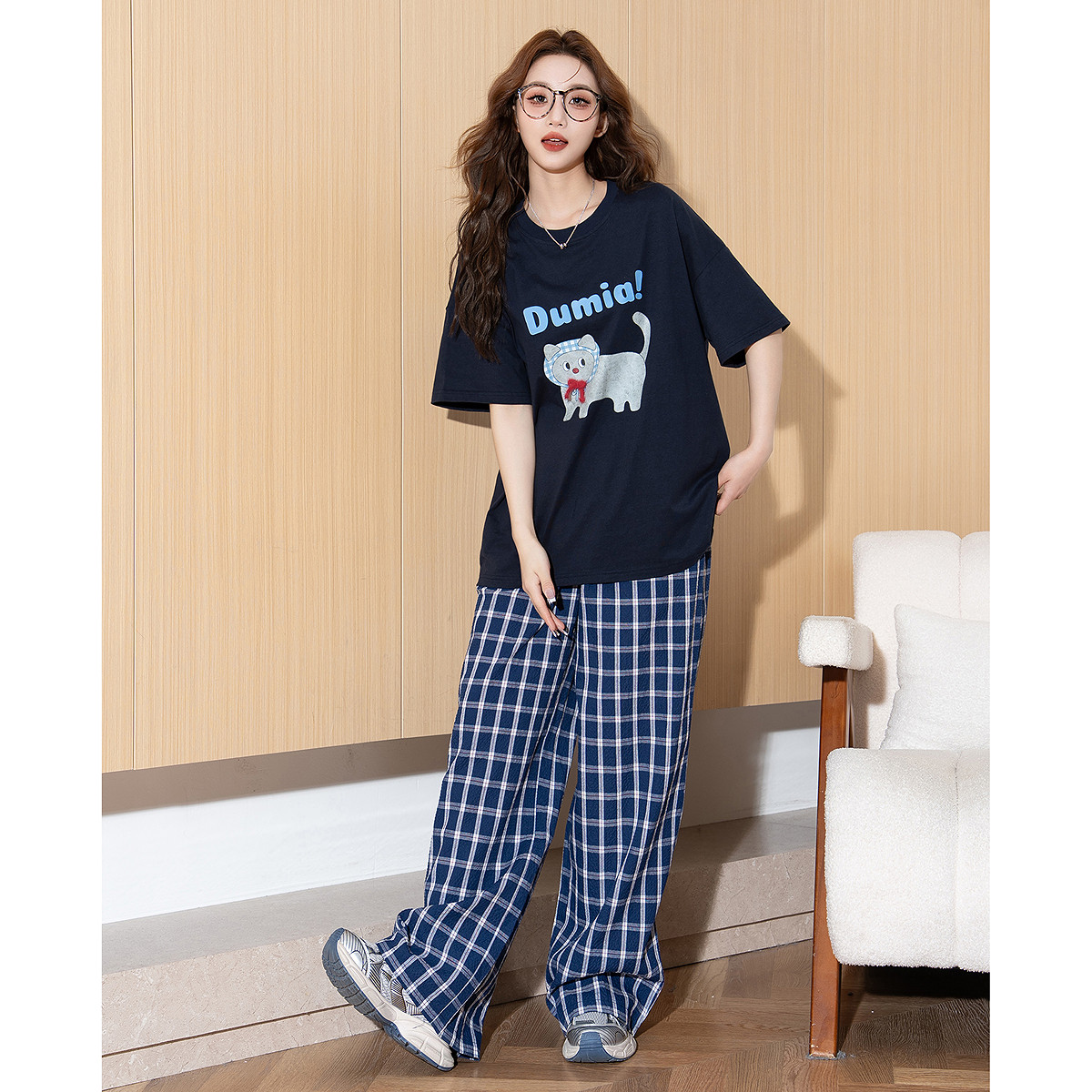 唐狮春夏季新款女休闲运动风短袖T恤女蓝色格纹阔腿裤套装穿搭