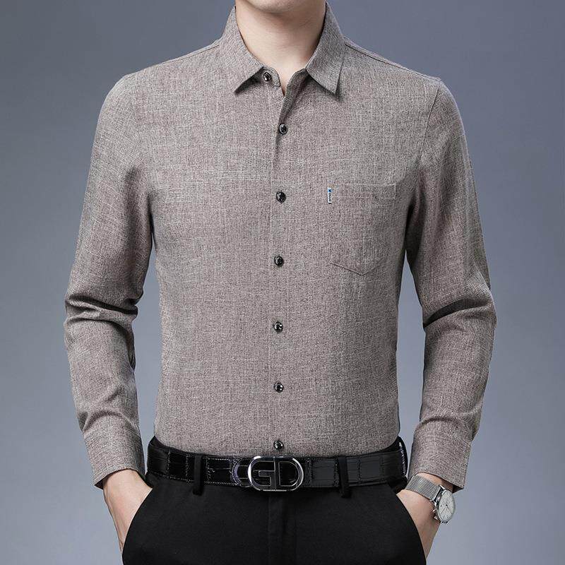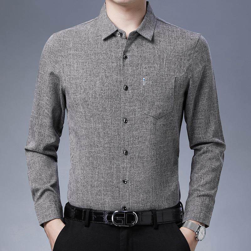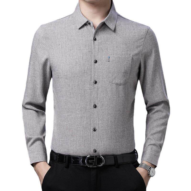 春秋季免烫中年男士仿亚麻纯色衬衣时尚商务真口袋爸爸装休闲衬衫
