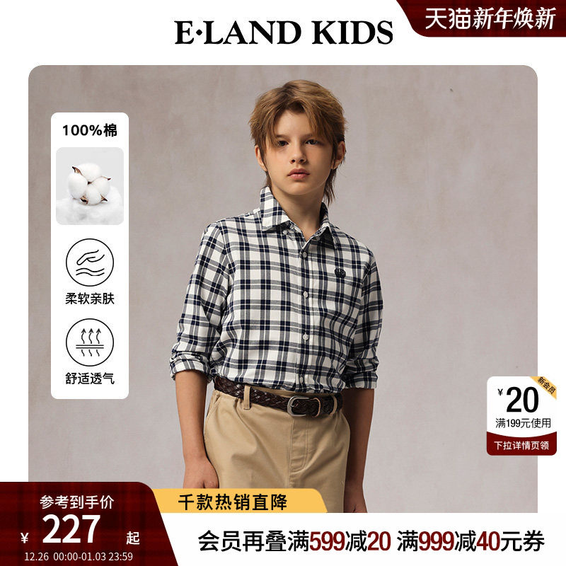 【100%棉】eland kids衣恋童装男童衬衫25年春秋季学院风格纹上衣