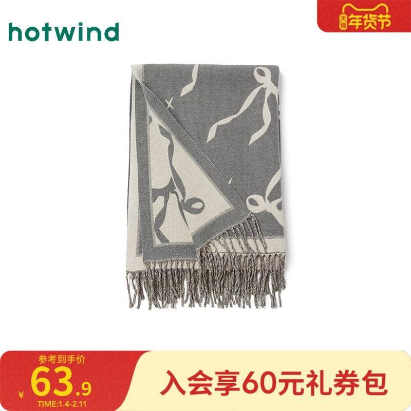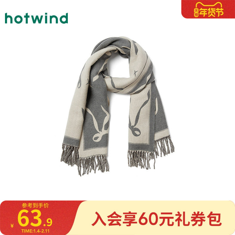 热风2025年冬季新款女士蝴蝶结提花梭织流苏围巾简约大气温暖舒适