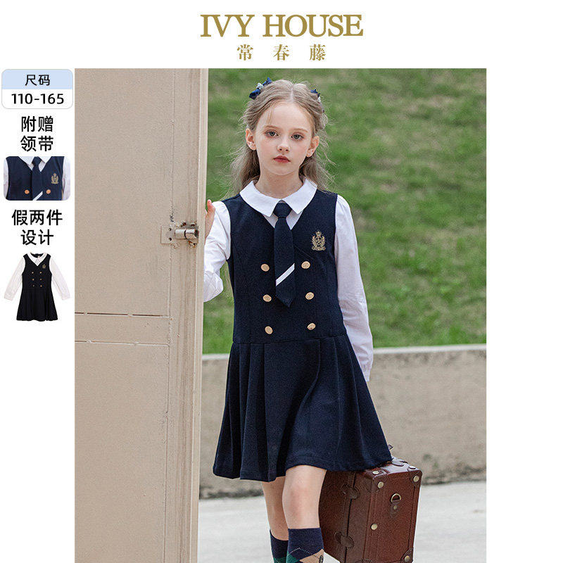 IVY HOUSE常春藤儿童装女童秋季款 学院风假两件撞色连衣裙亲子装