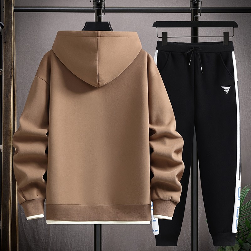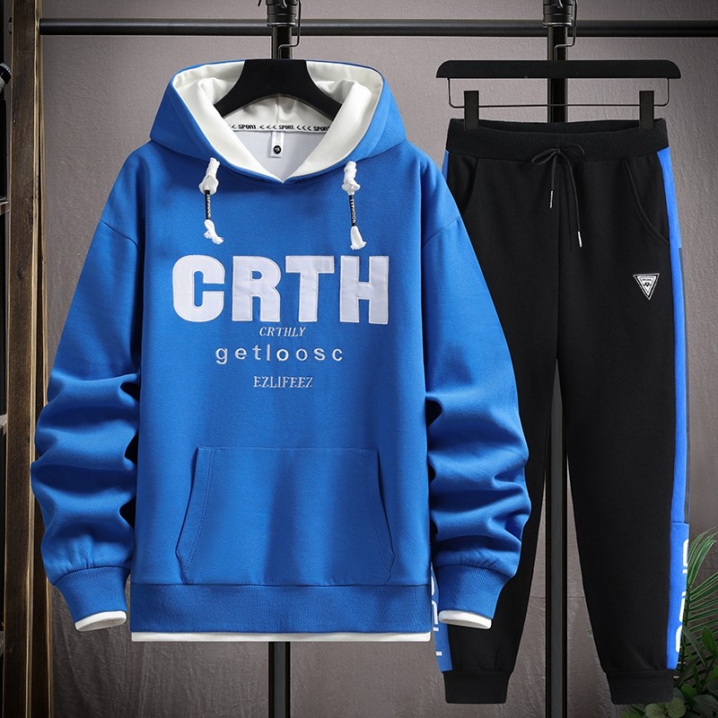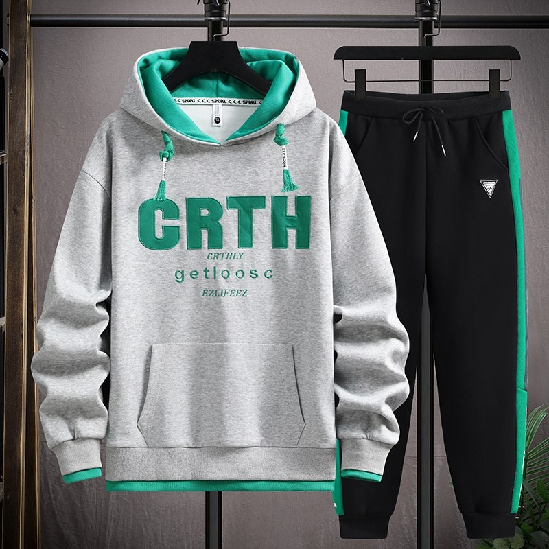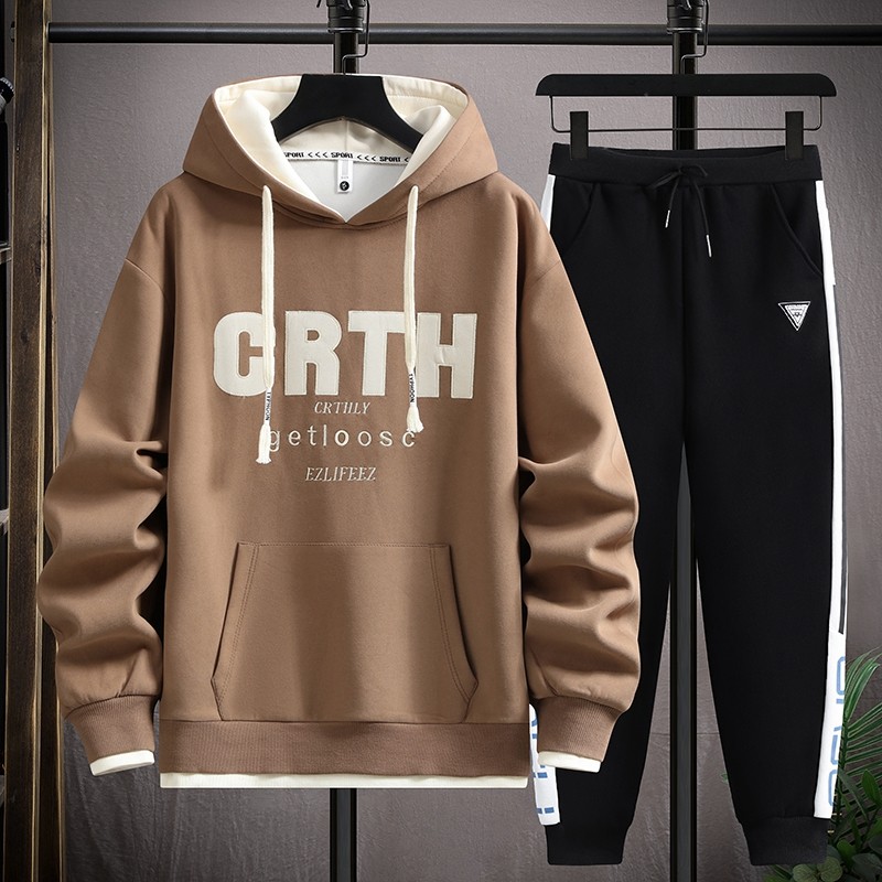 青少年连帽加绒卫衣男孩休闲假两件学生两件套加厚长袖运动套装男