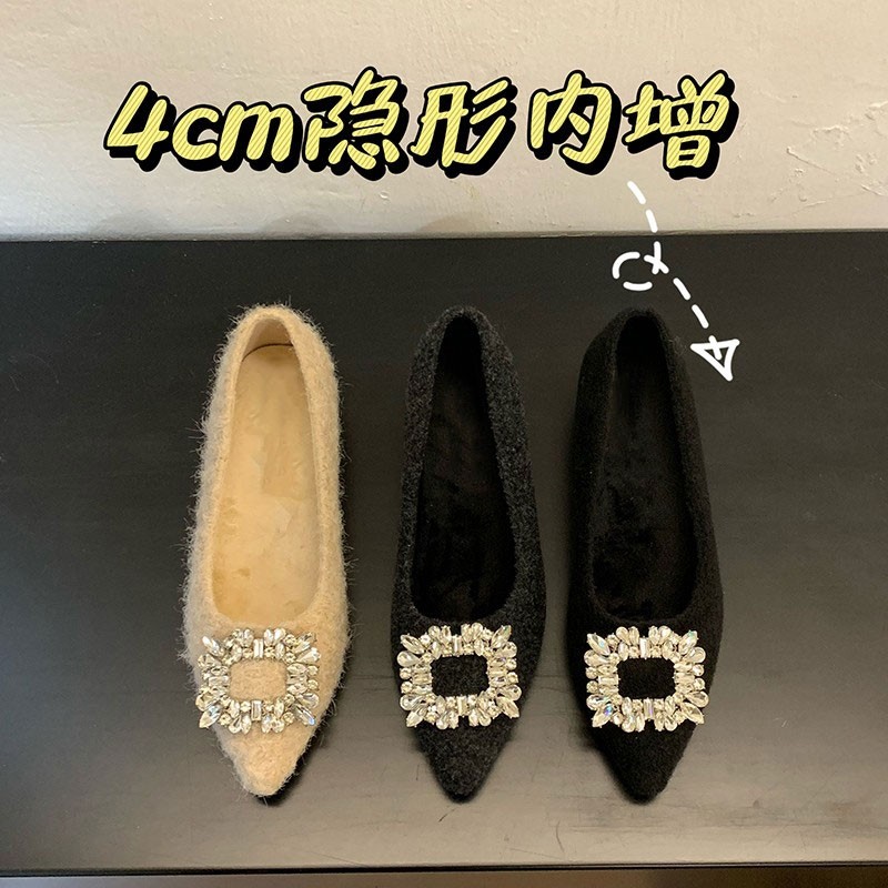 内增高单鞋女2025新款冬季加绒水钻尖头外穿百搭浅口小个子毛毛鞋