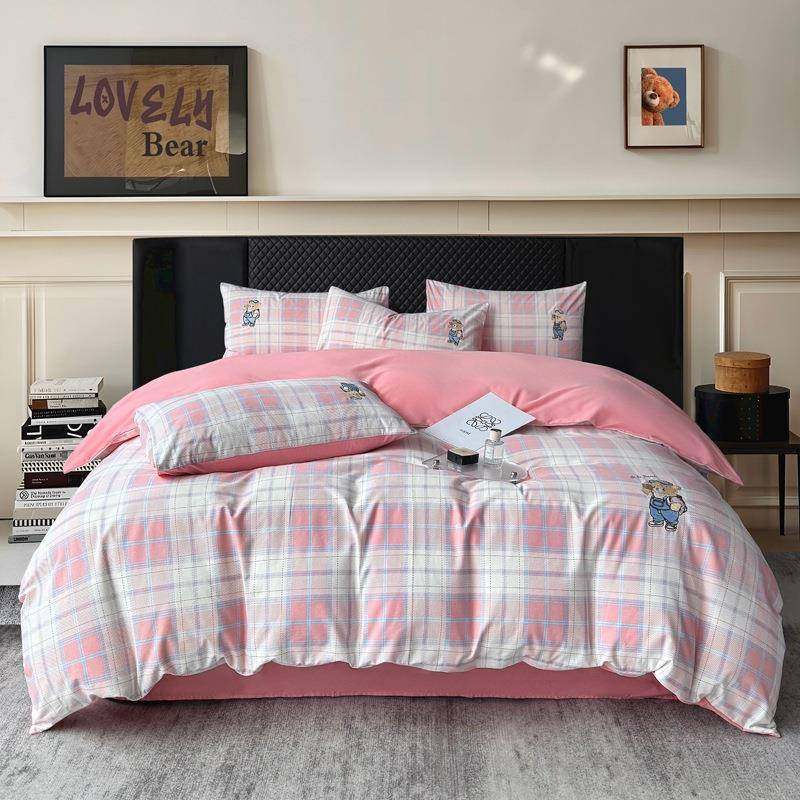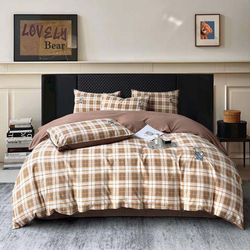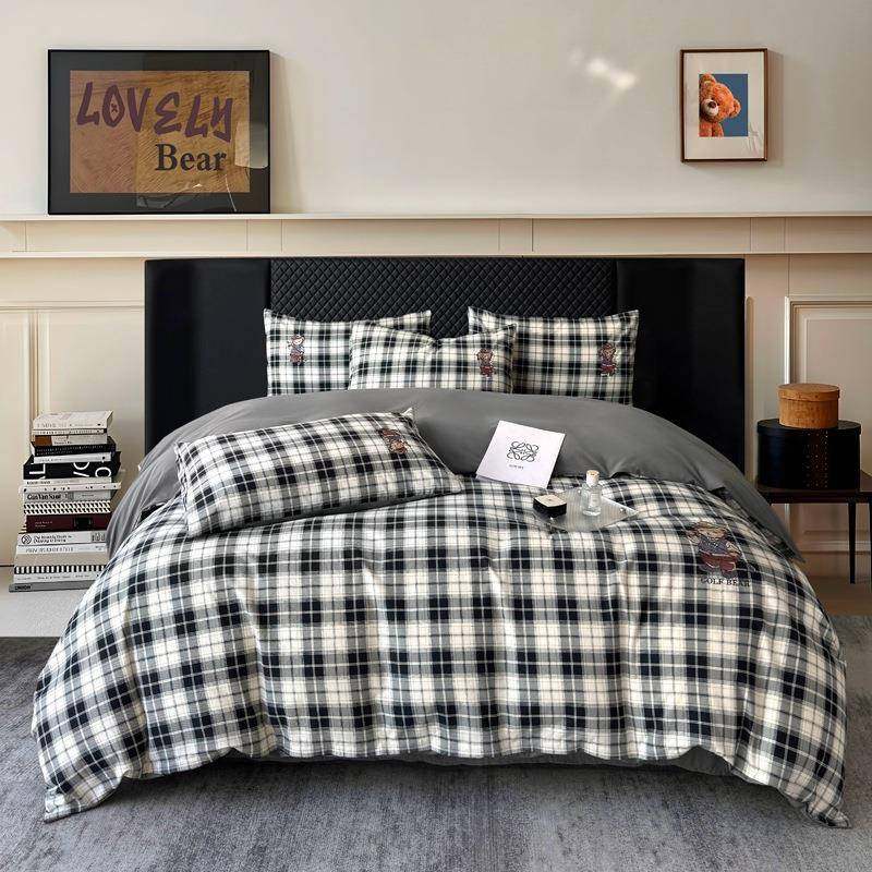 新款全棉磨毛英伦风格子四件套被套床上用品亲肤刺绣品舒适套件