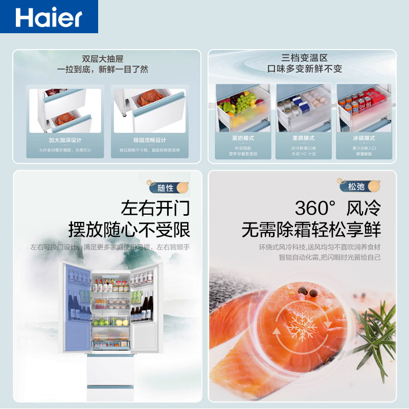 海尔冰箱310升三开门一级能效风冷无霜变频节能小型家用官方正品