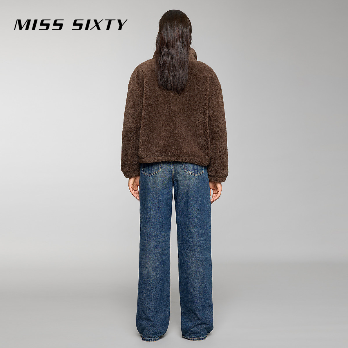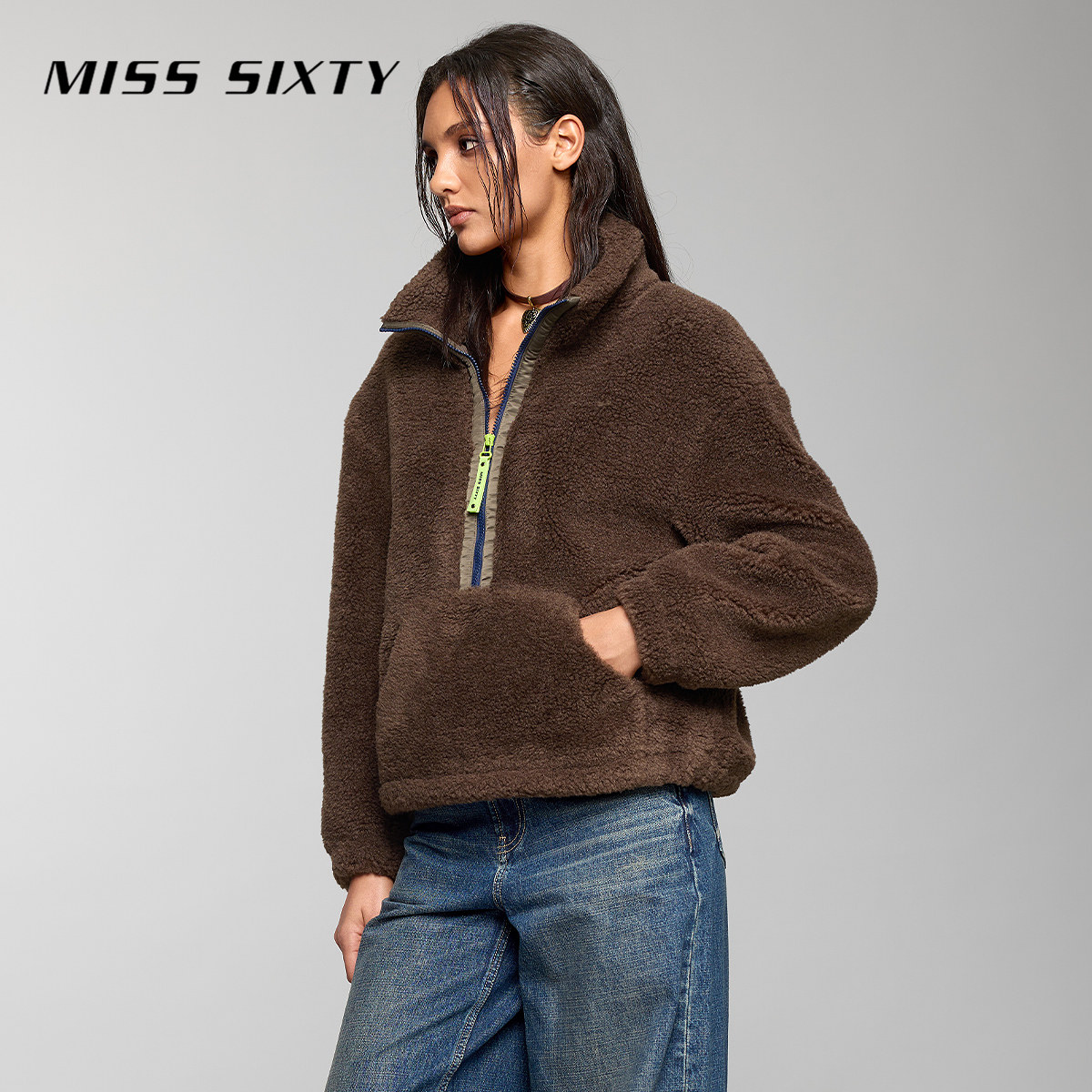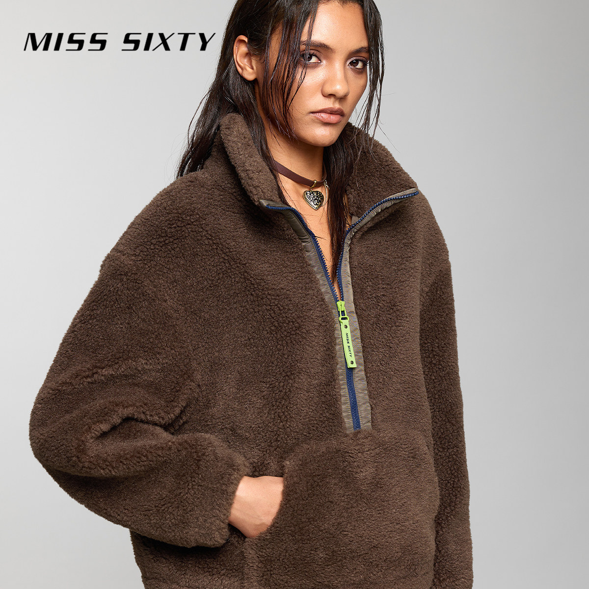 Miss Sixty仿皮草卫衣女套头半开领复古美拉德撞色拉链厚运动风