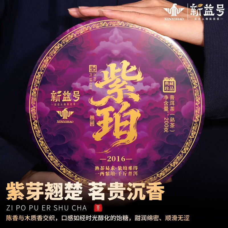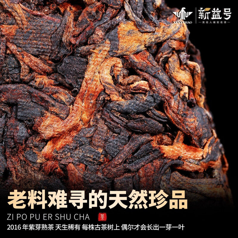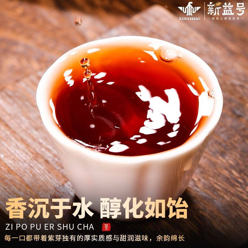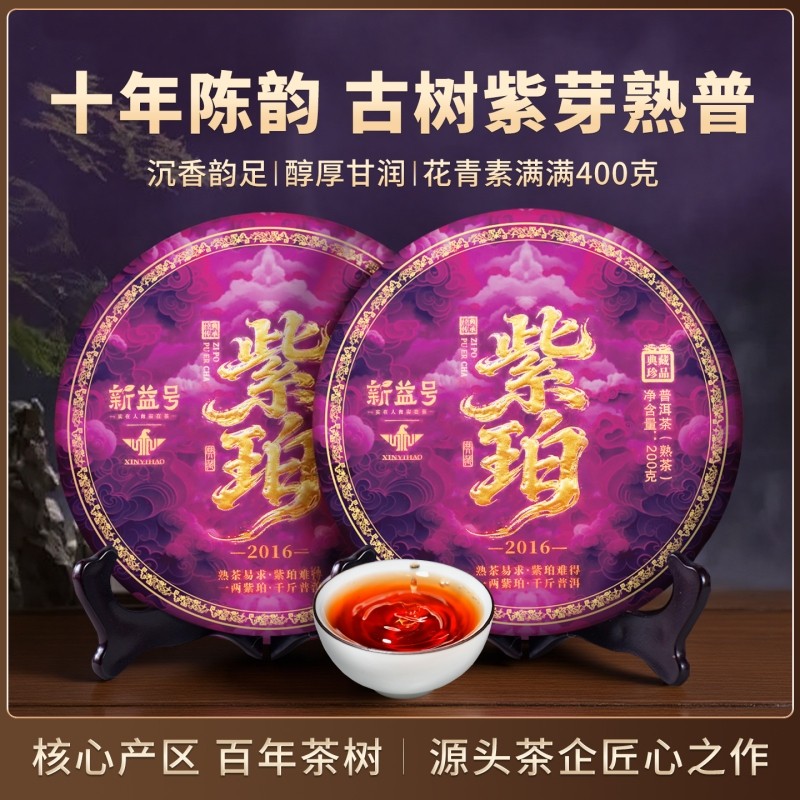 紫芽普洱熟茶饼布朗山十年以上云南勐海古树茶老熟普口粮茶叶礼盒
