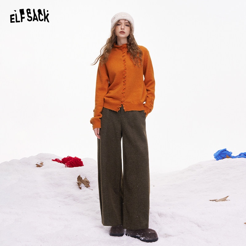 妖精的口袋复古咖色加绒阔腿裤女2025年冬季新款宽松休闲直筒裤子