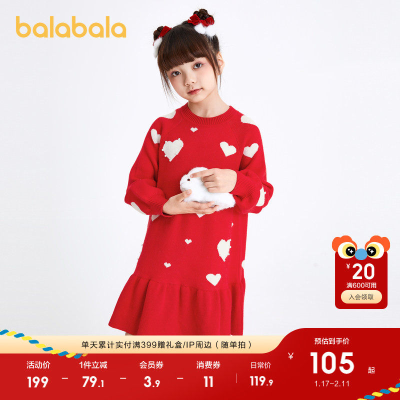 巴拉巴拉女童连衣裙宝宝拜年裙子冬装新款童装儿童红色洋气公主裙