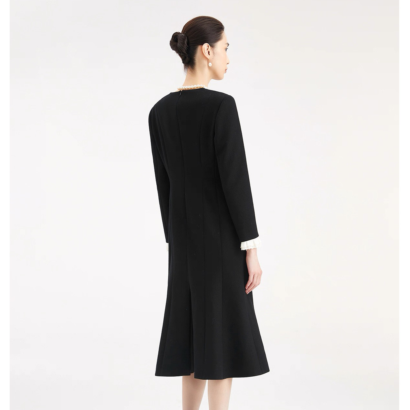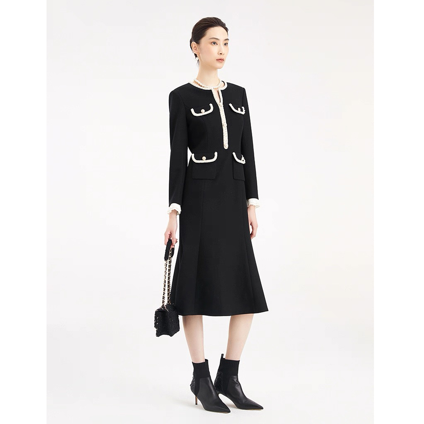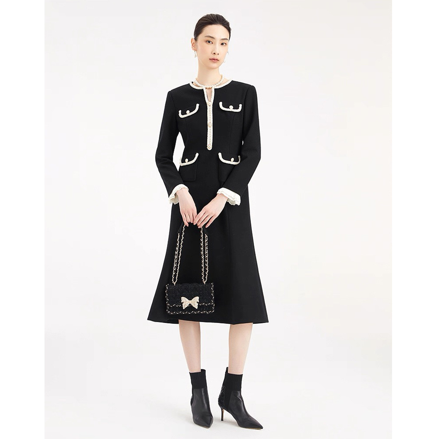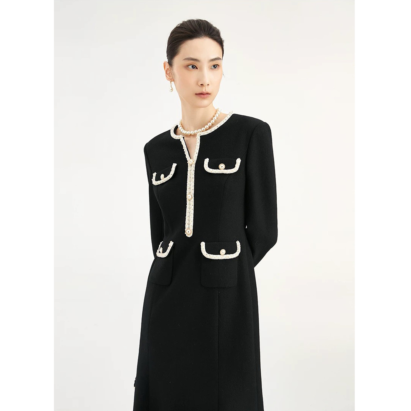 珂莱商场同款2025秋冬季新款女装气质收腰钉珠中长款羊毛呢连衣裙