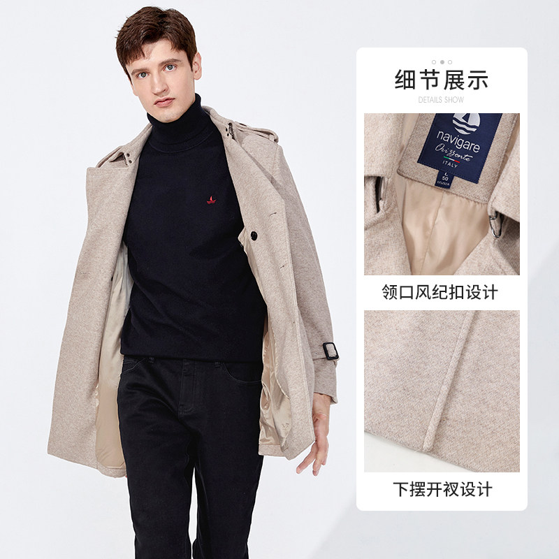 Navigare意大利小帆船2023冬季中长款毛呢大衣男士保暖粗花呢外套