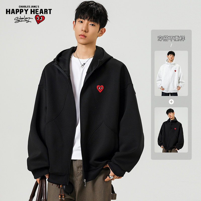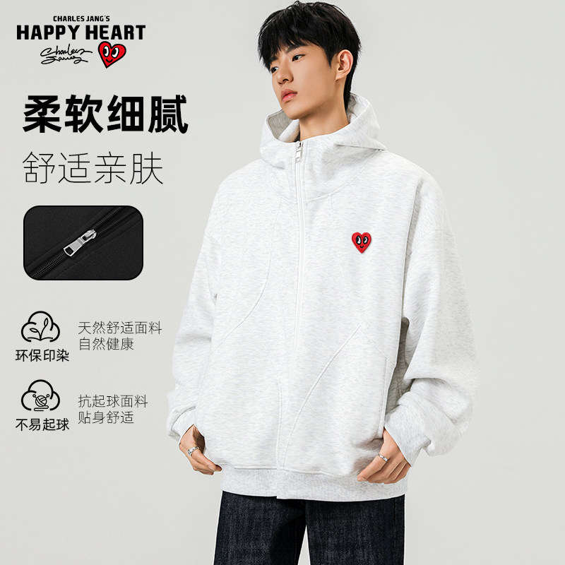 查尔斯桃心 美式拼接灰色连帽开衫卫衣男女春秋季休闲百搭外套