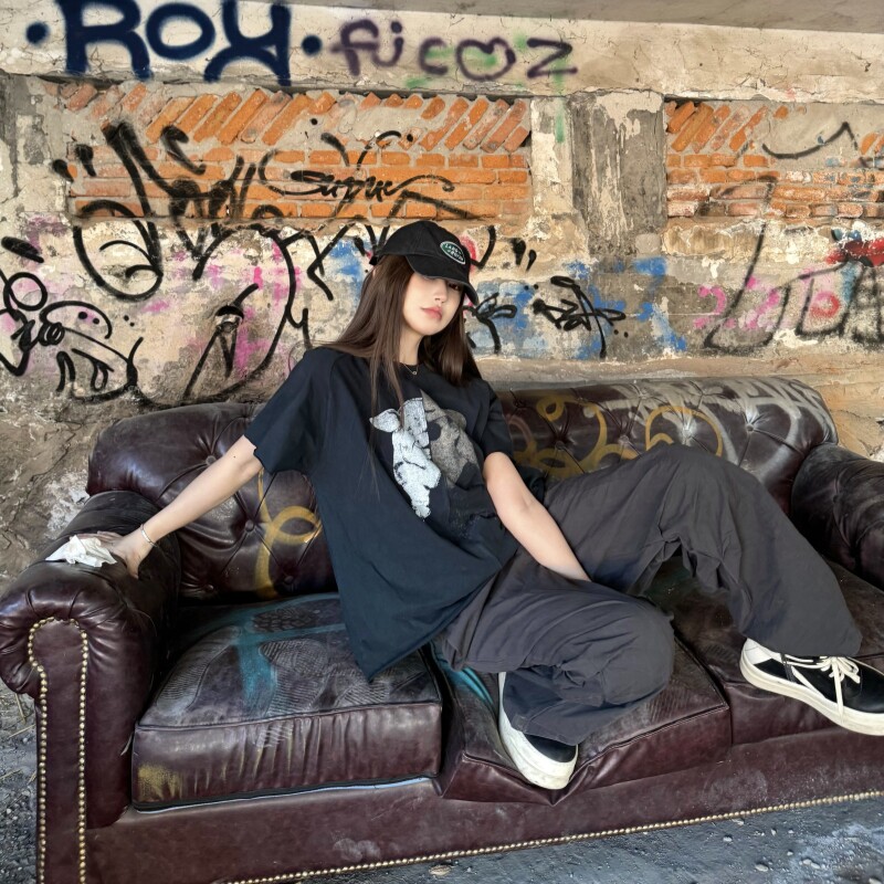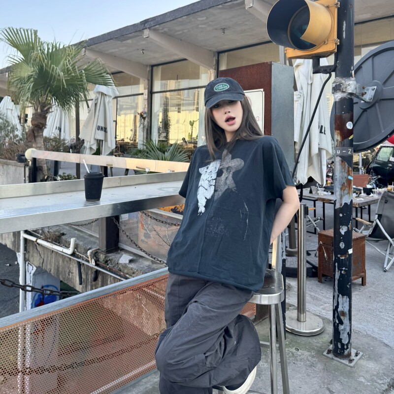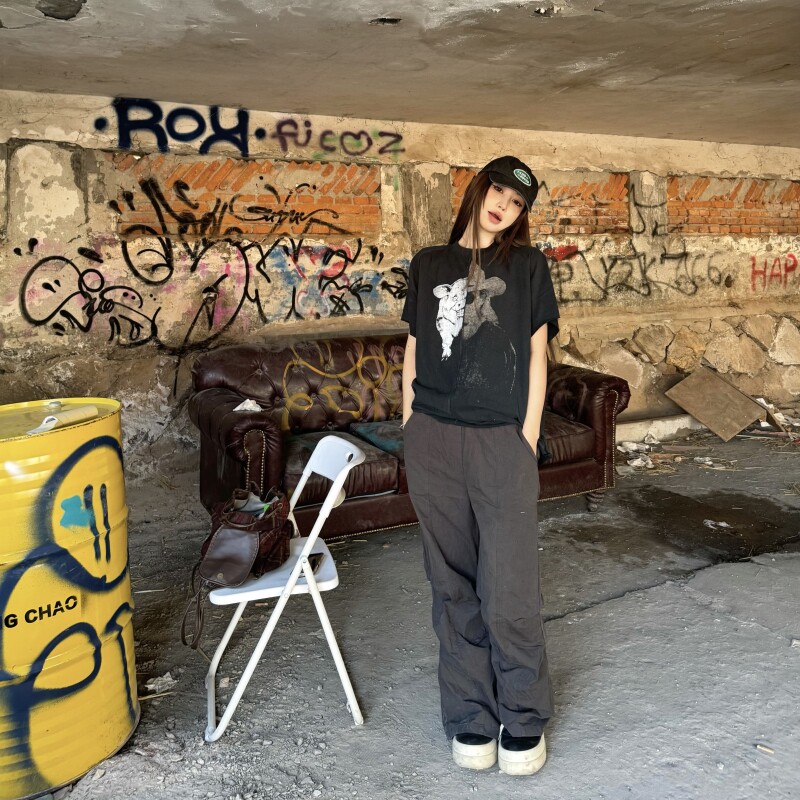ERD忧郁富二代拼接猪人印花水洗短袖高街美式休闲潮牌流行T恤Tee