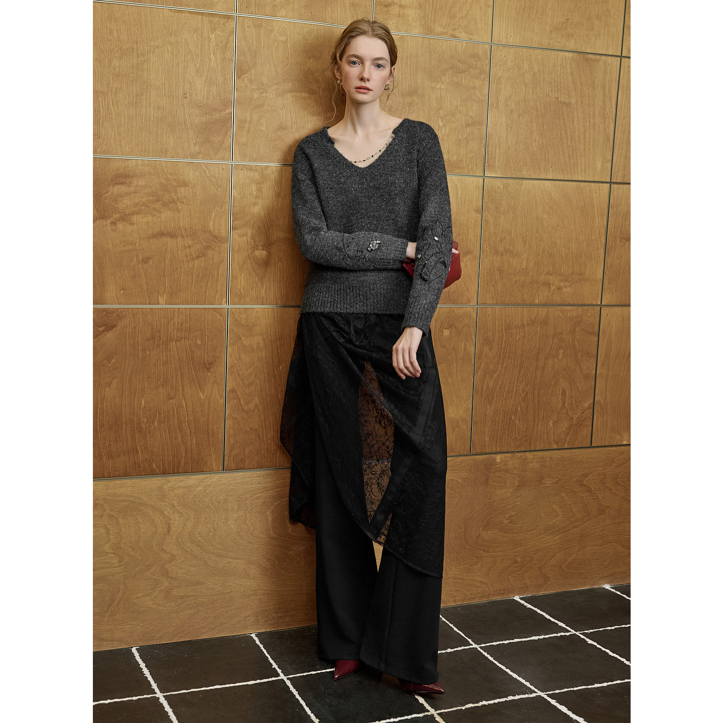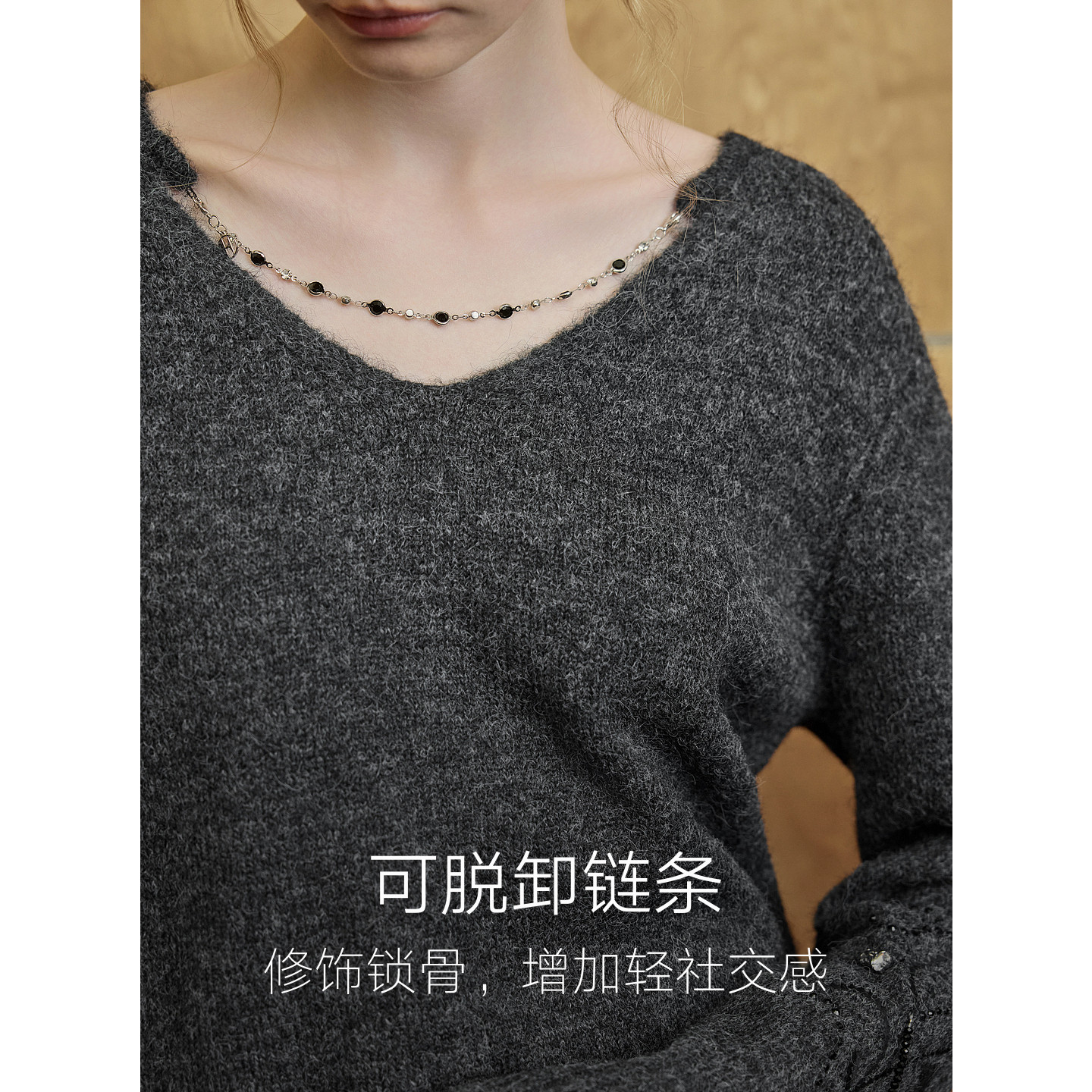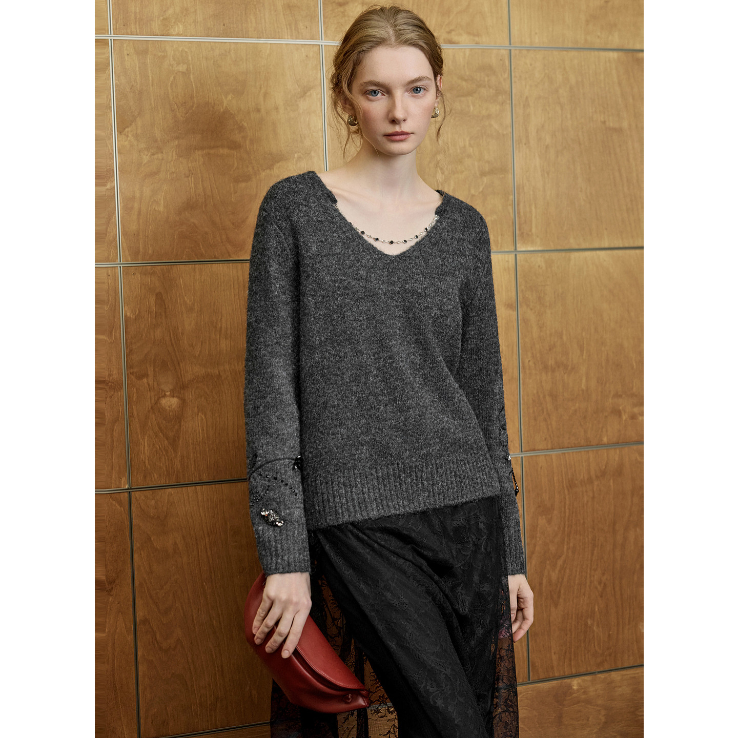 ELLE灰色钉钻高级感v领毛衣女2026春季新款绵羊毛宽松休闲针织衫