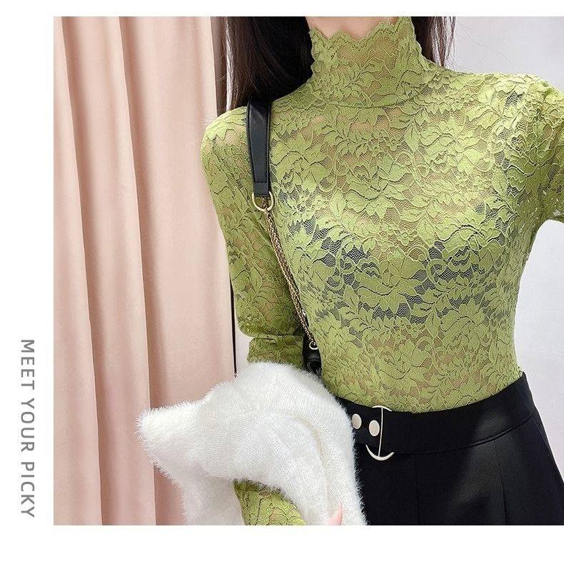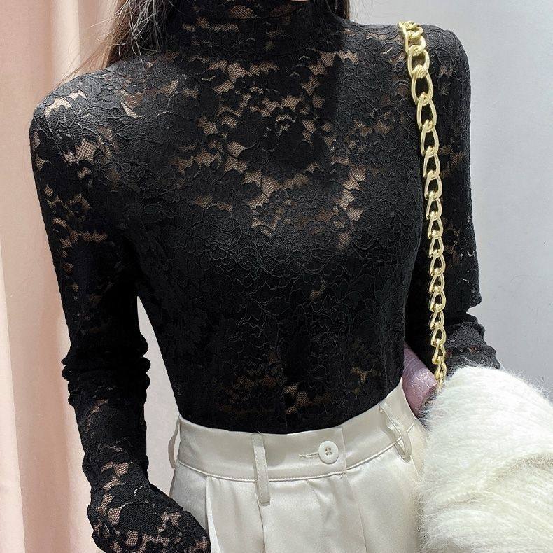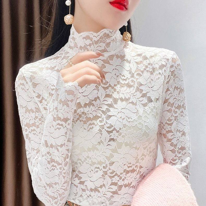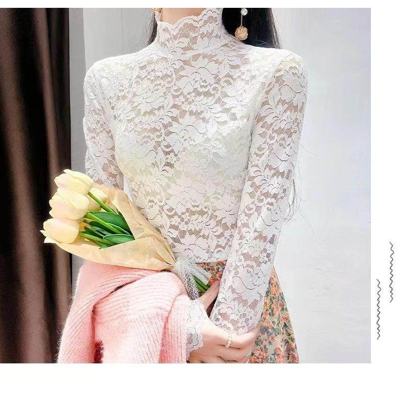 秋冬蕾丝打底衫女新款修身长袖半高领性感上衣配小香风内搭蕾丝衫