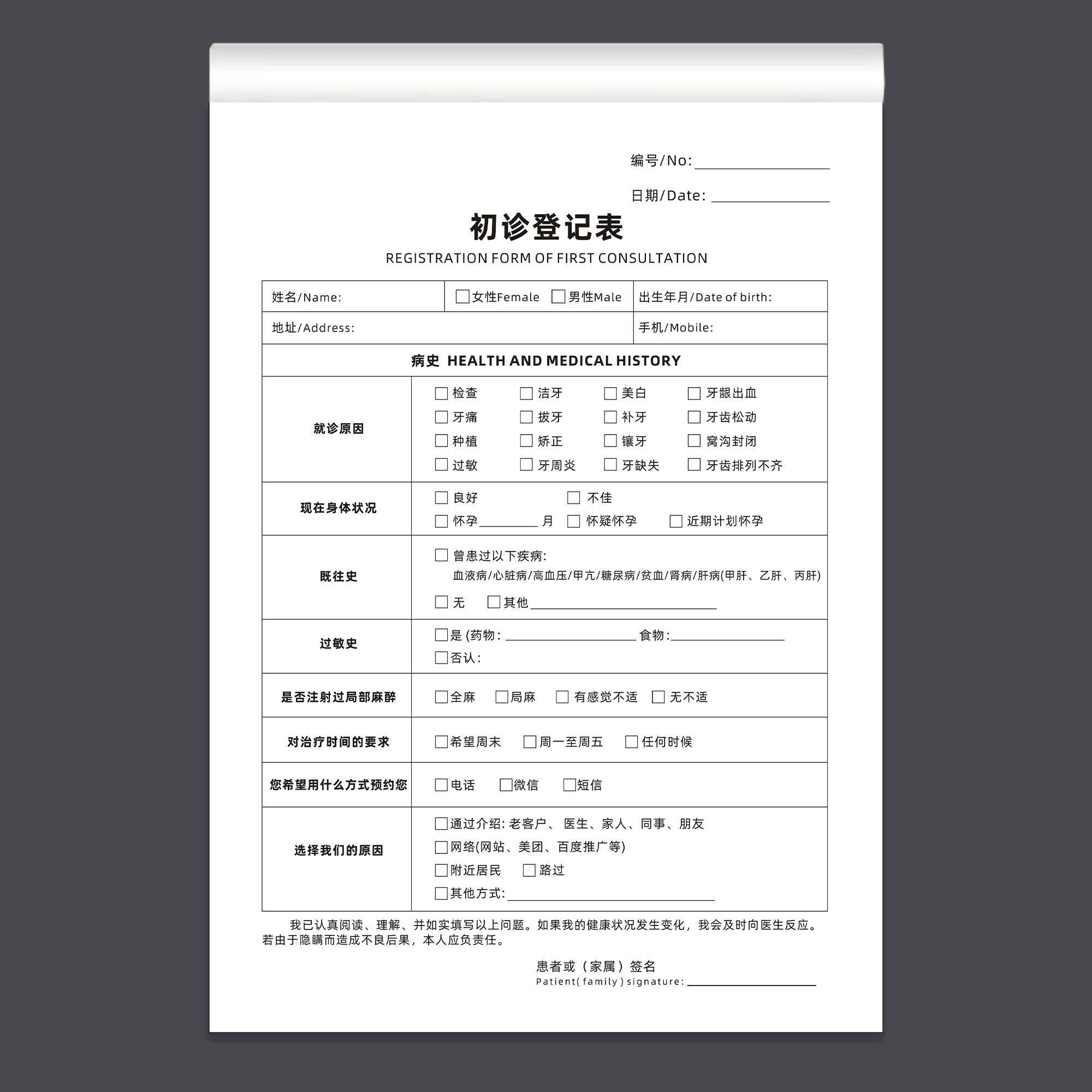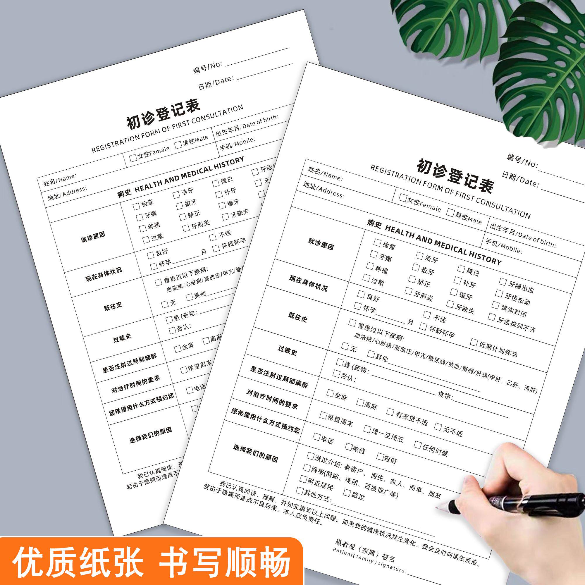 初诊登记表儿童牙齿口腔健康义诊检查记录单A4体检咨询问诊单二联