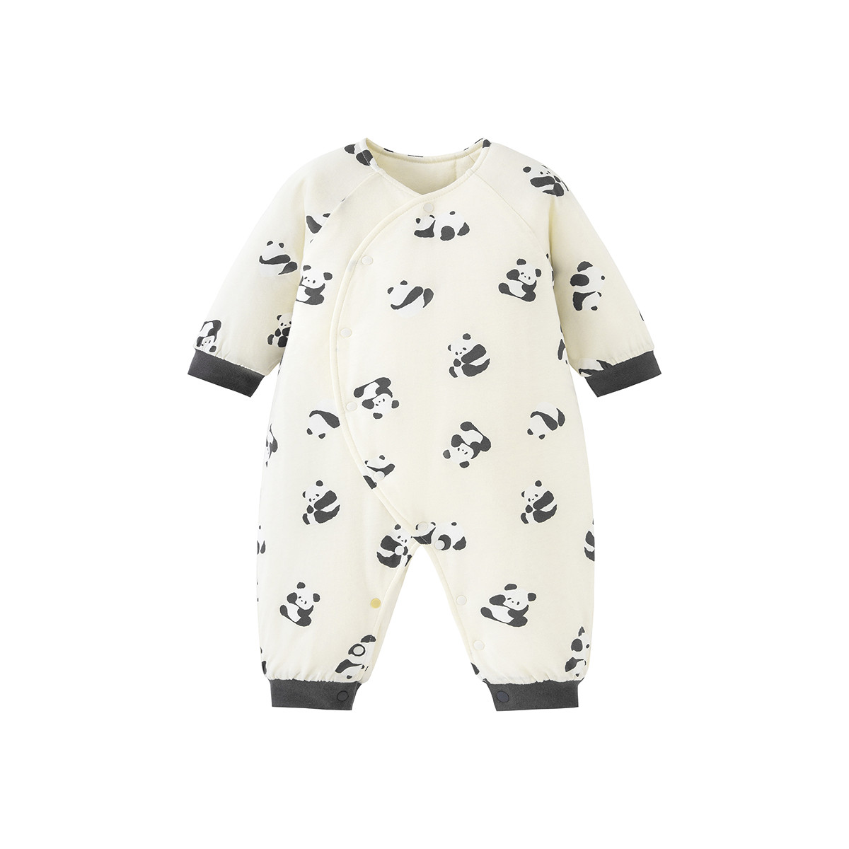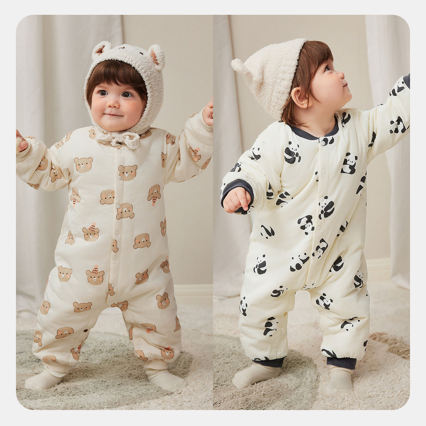 小猪大卫新生儿秋季保暖连体衣男女宝宝卡通印花中开夹棉爬服