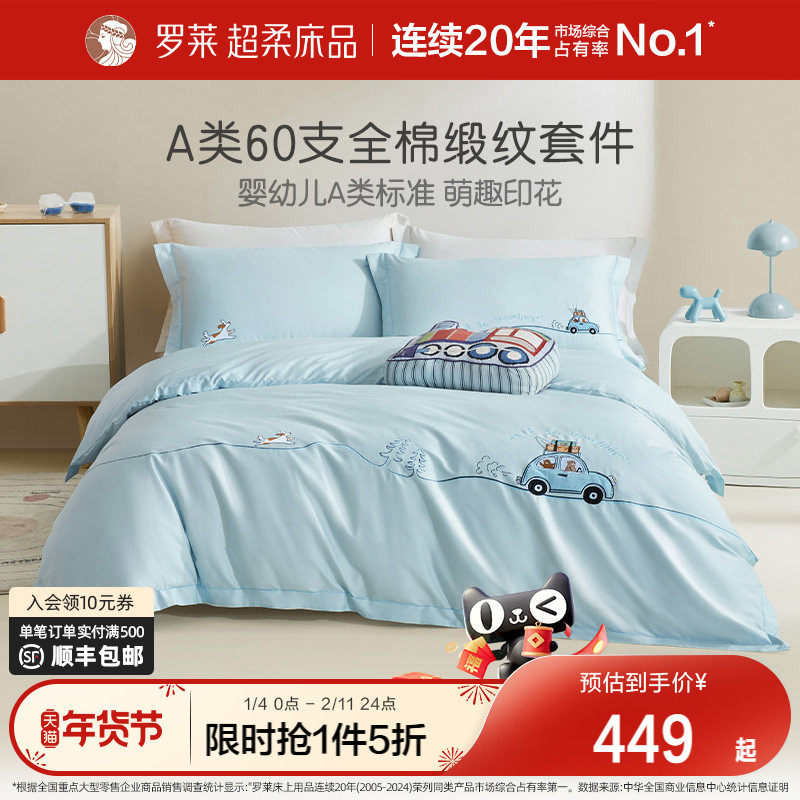 罗莱家纺儿童全棉60支纯棉贡缎高支四件套被套床单学生A类萌趣