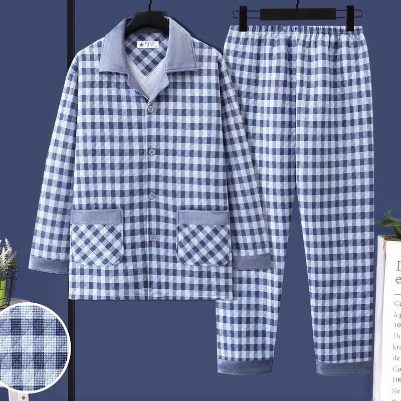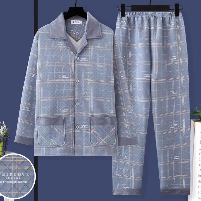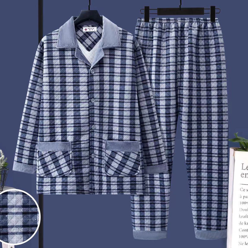 加大码男士秋冬睡衣加厚夹层棉中年爸爸保暖秋季空气棉家居服套装