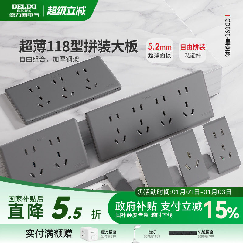 德力西超薄118型开关插座家用多孔墙开关五孔十孔16a大板灰色696