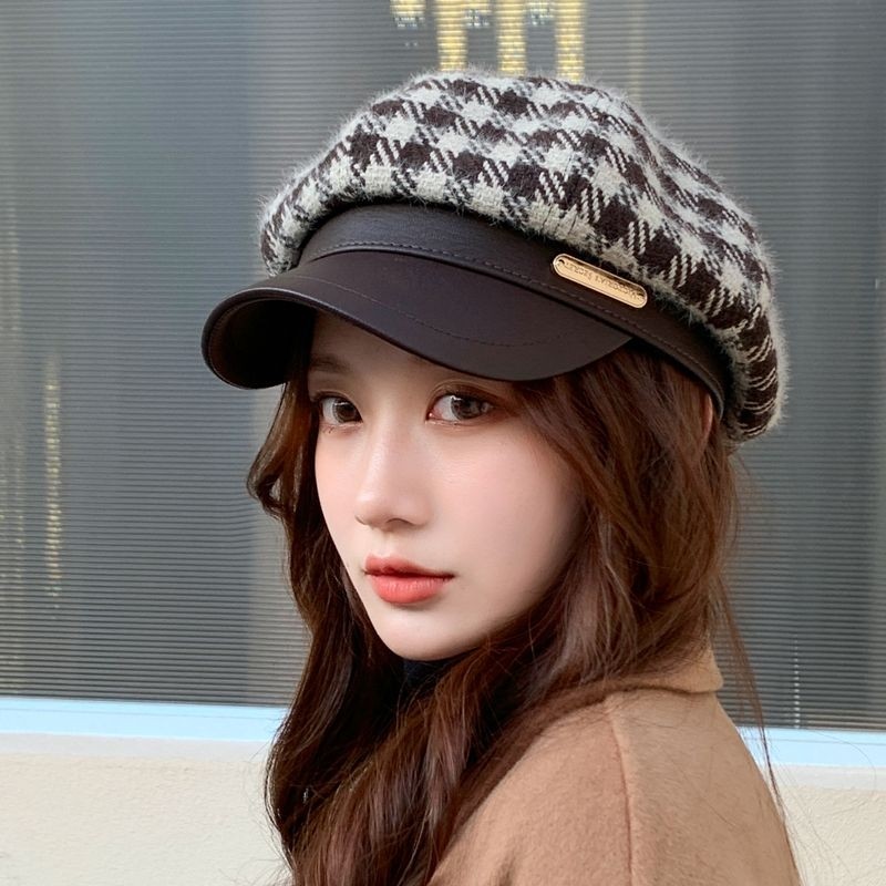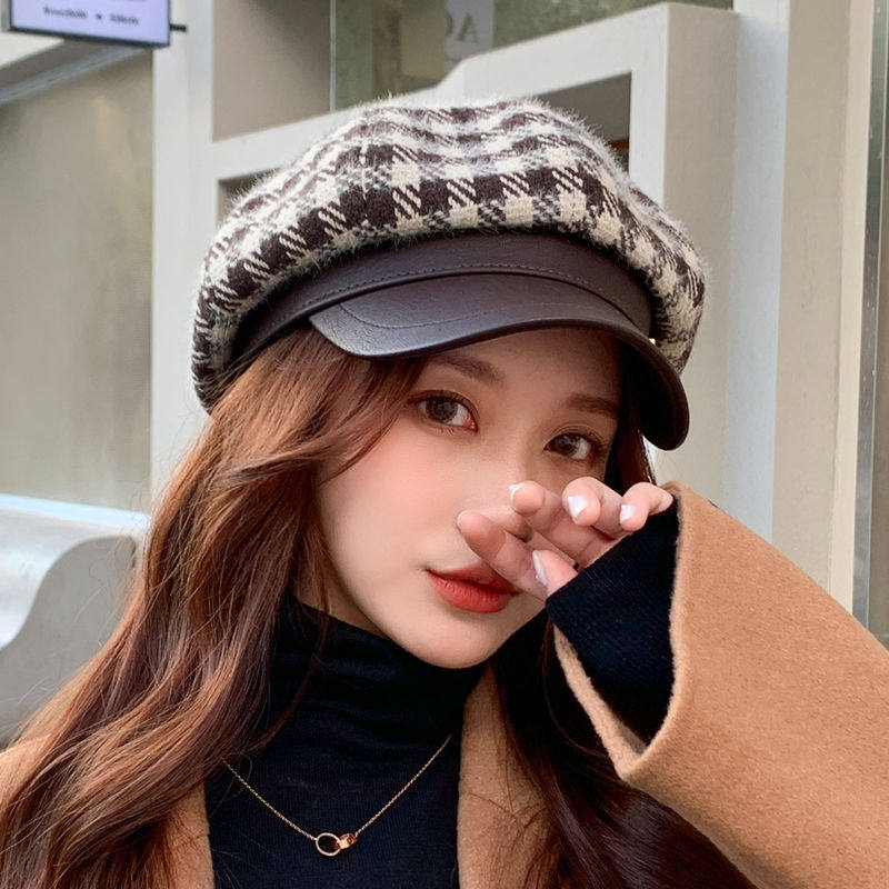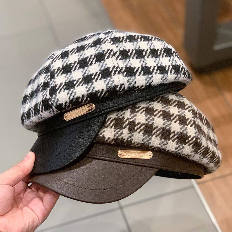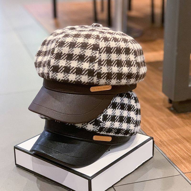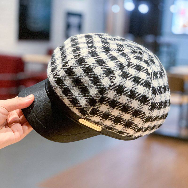 日系千鸟格八角帽子女韩系复古鸭舌帽秋冬季英伦报童帽贝雷帽格纹