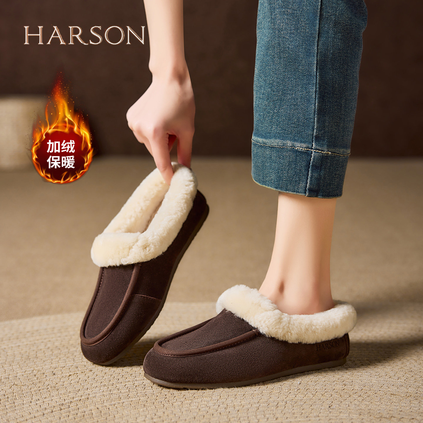 哈森毛毛鞋女款25冬季加绒保暖博肯半拖鞋平底棉鞋一脚蹬豆豆鞋