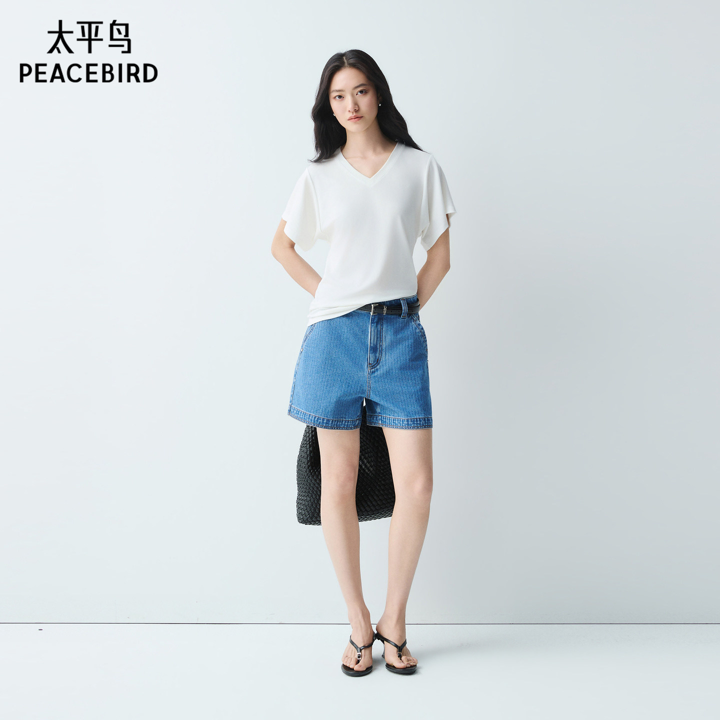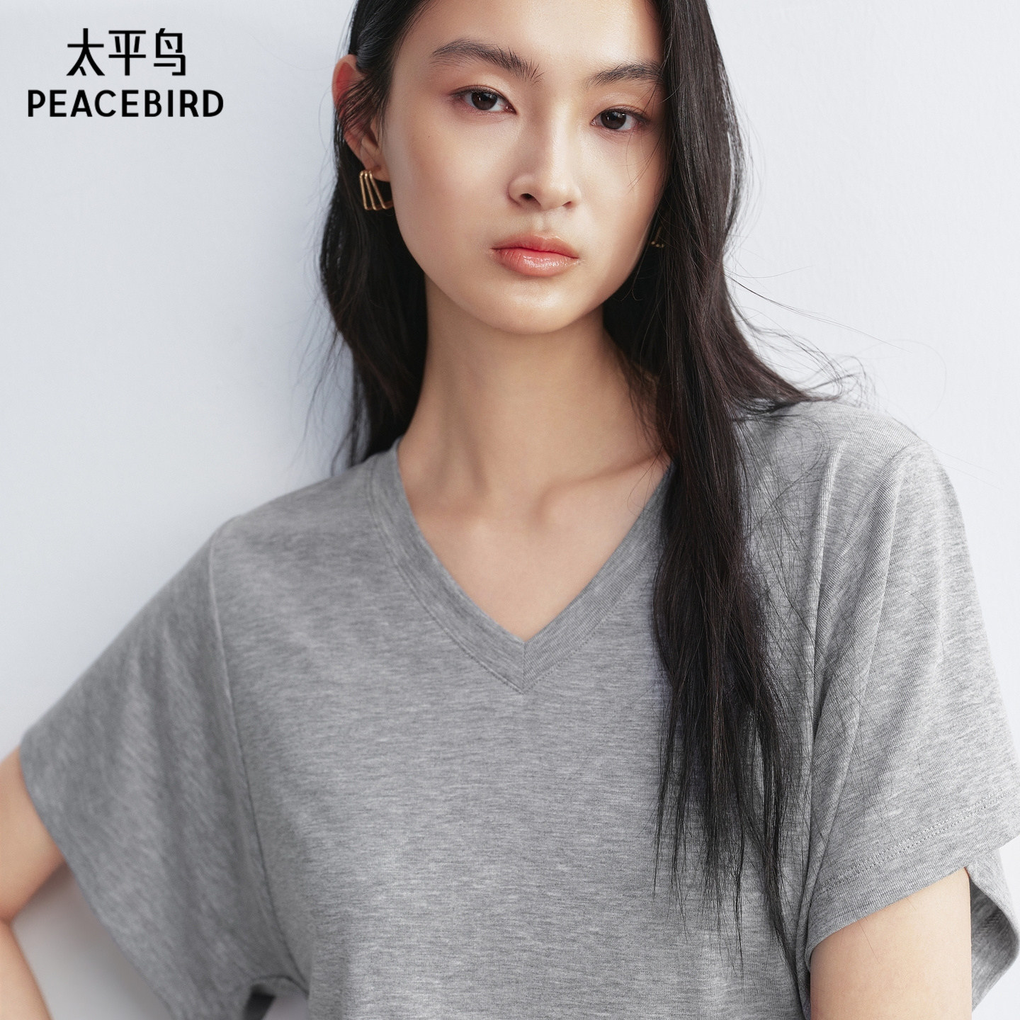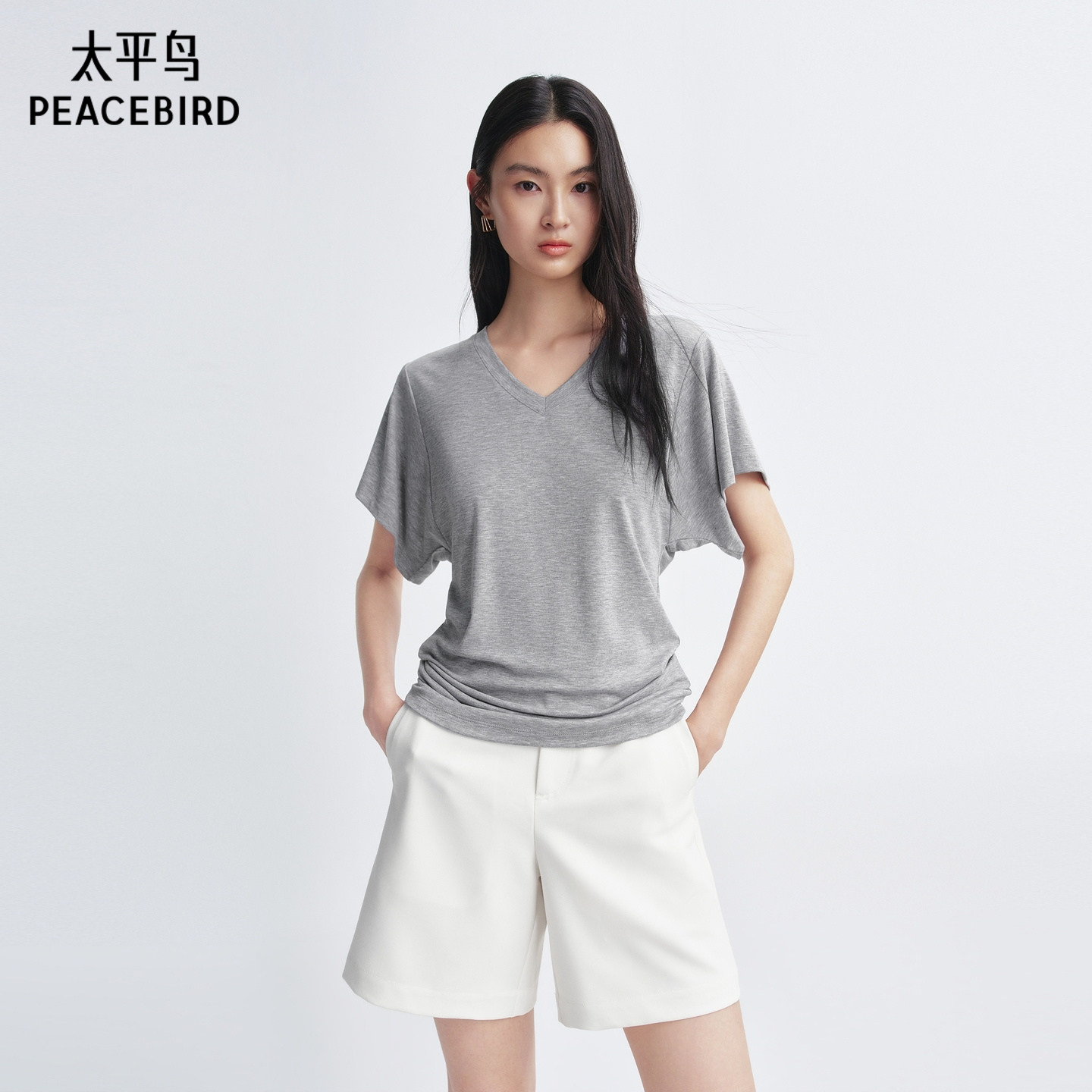 太平鸟 莱赛尔混纺V领短袖T恤26夏季新款蝙蝠袖收腰松弛感上衣女