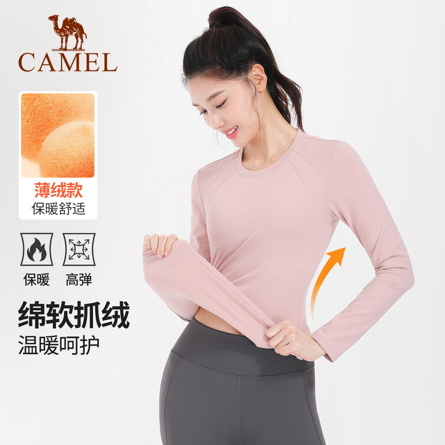 骆驼瑜伽T恤女秋冬薄绒防风保暖运动上衣立领修身纯色加绒长袖衫