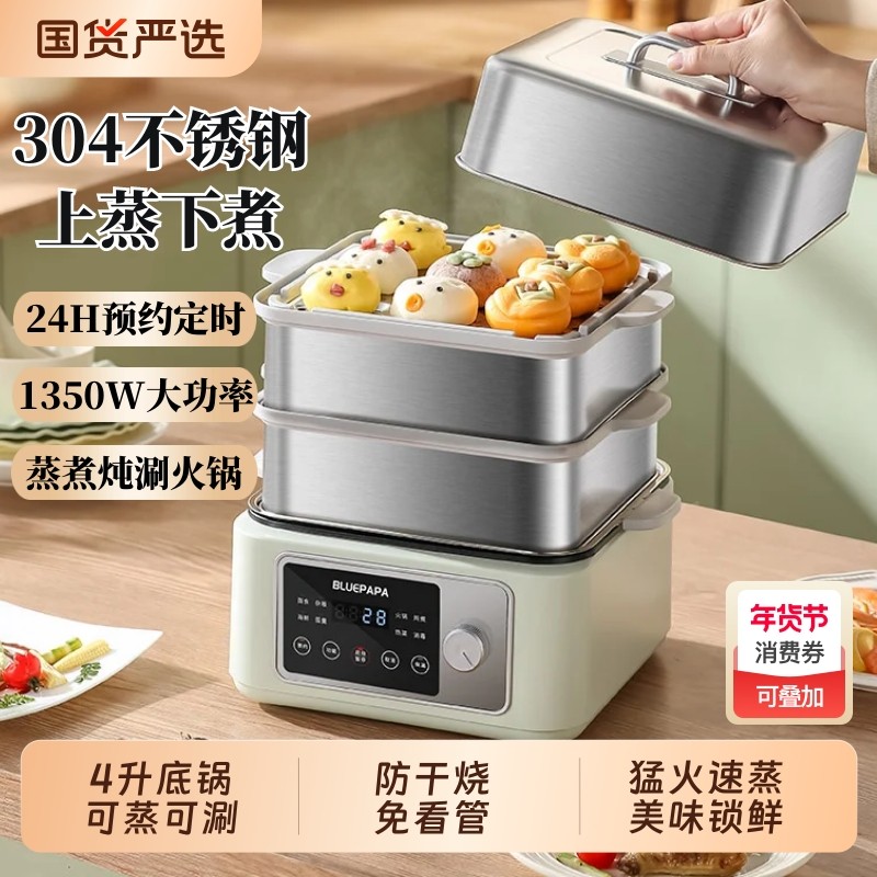 304不锈钢电蒸锅家用全自动多功能大容量蒸煮一体多层三层蒸汽锅