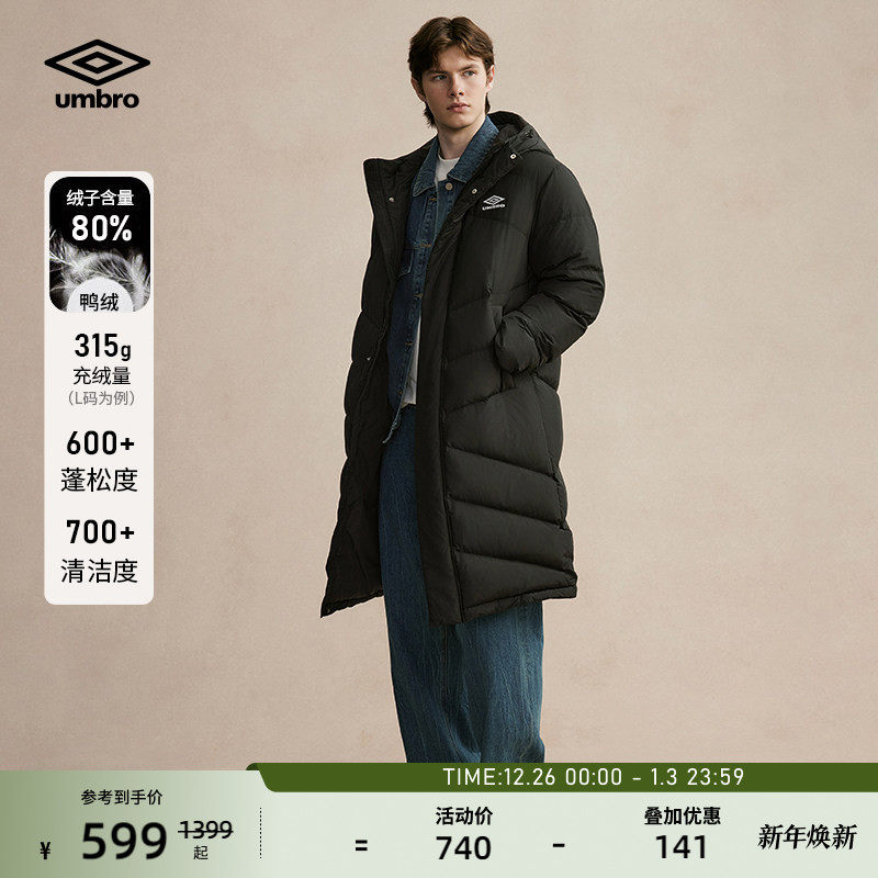 umbro茵宝官方运动足球鸭绒连帽中长款户外男女款冬季保暖羽绒服