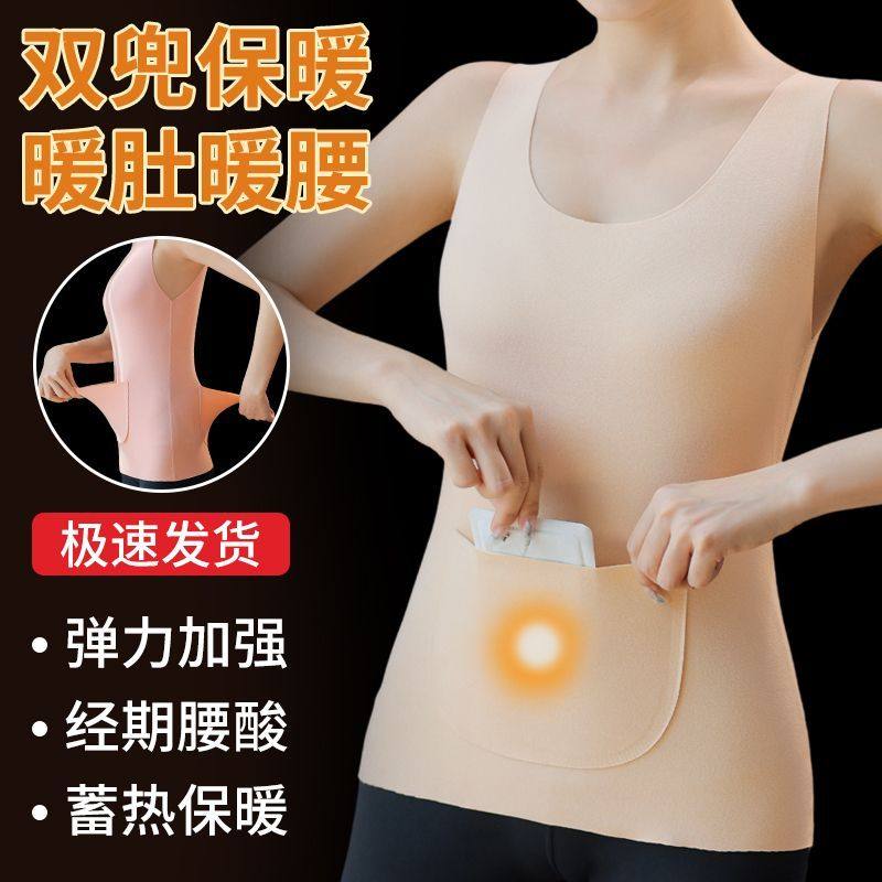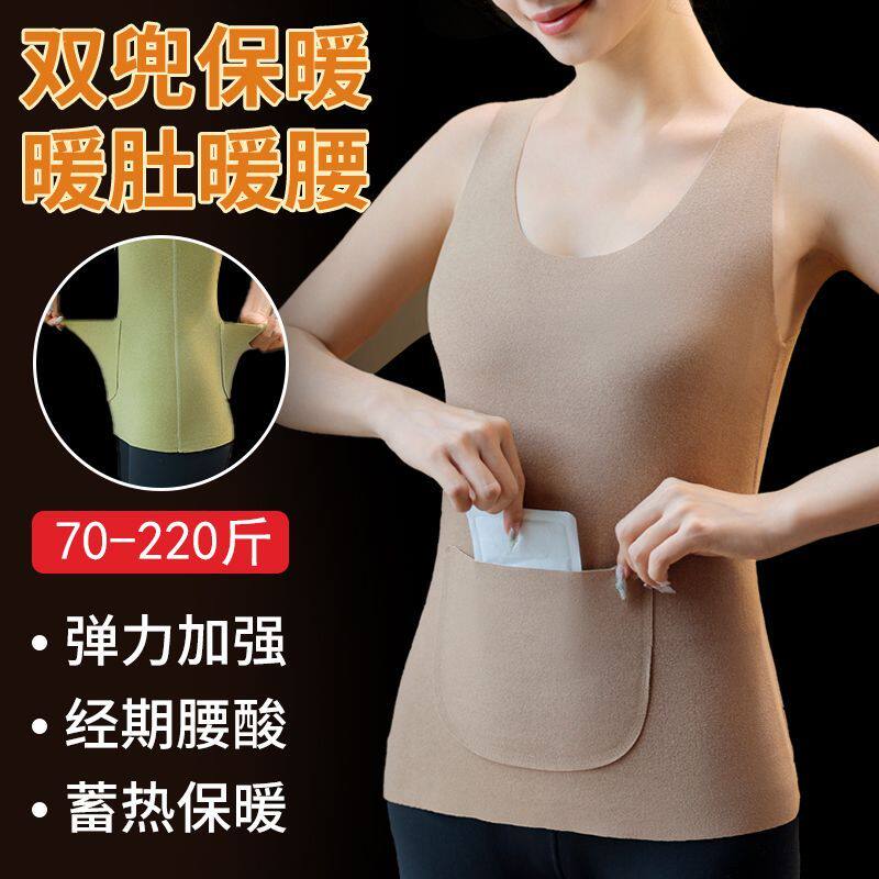 加绒保暖背心女士秋冬季护腰带口袋放暖宝宝德绒防寒肤色黑色可放
