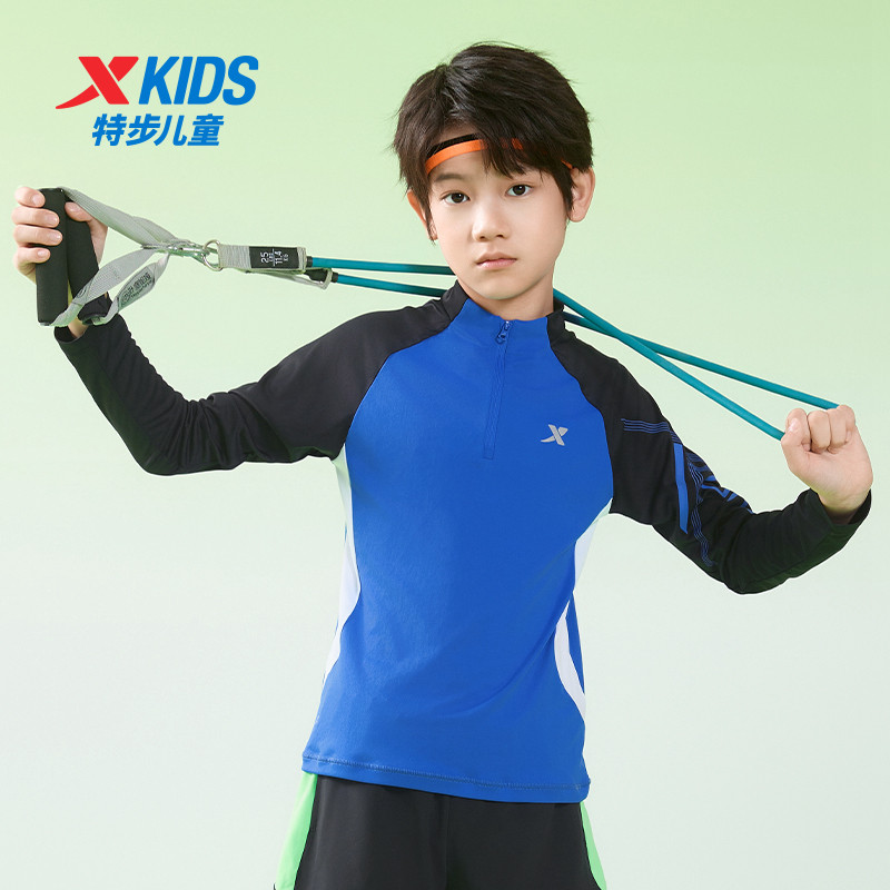 特步童装男童长袖T恤2026春季款儿童半开襟速干长t中大童运动上衣