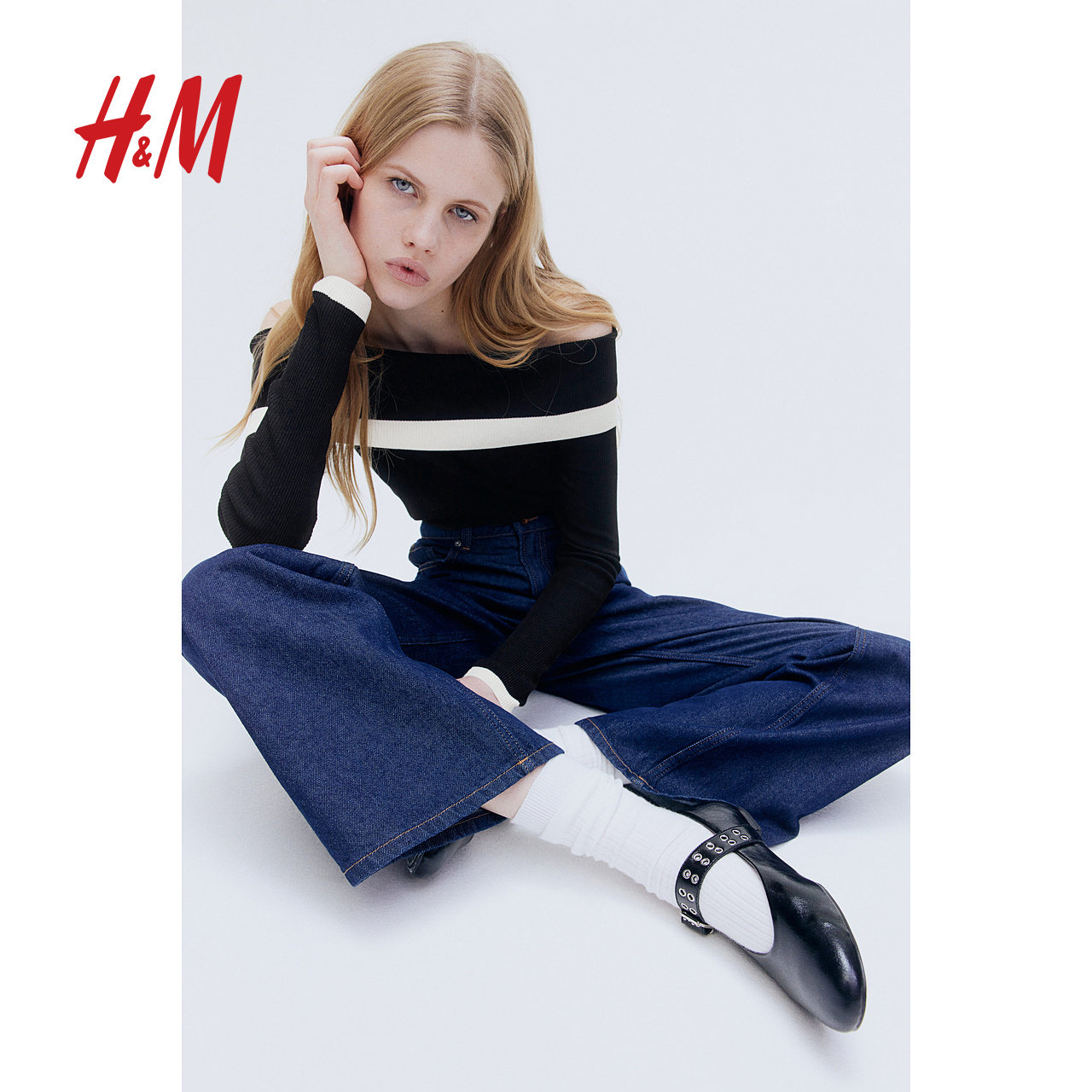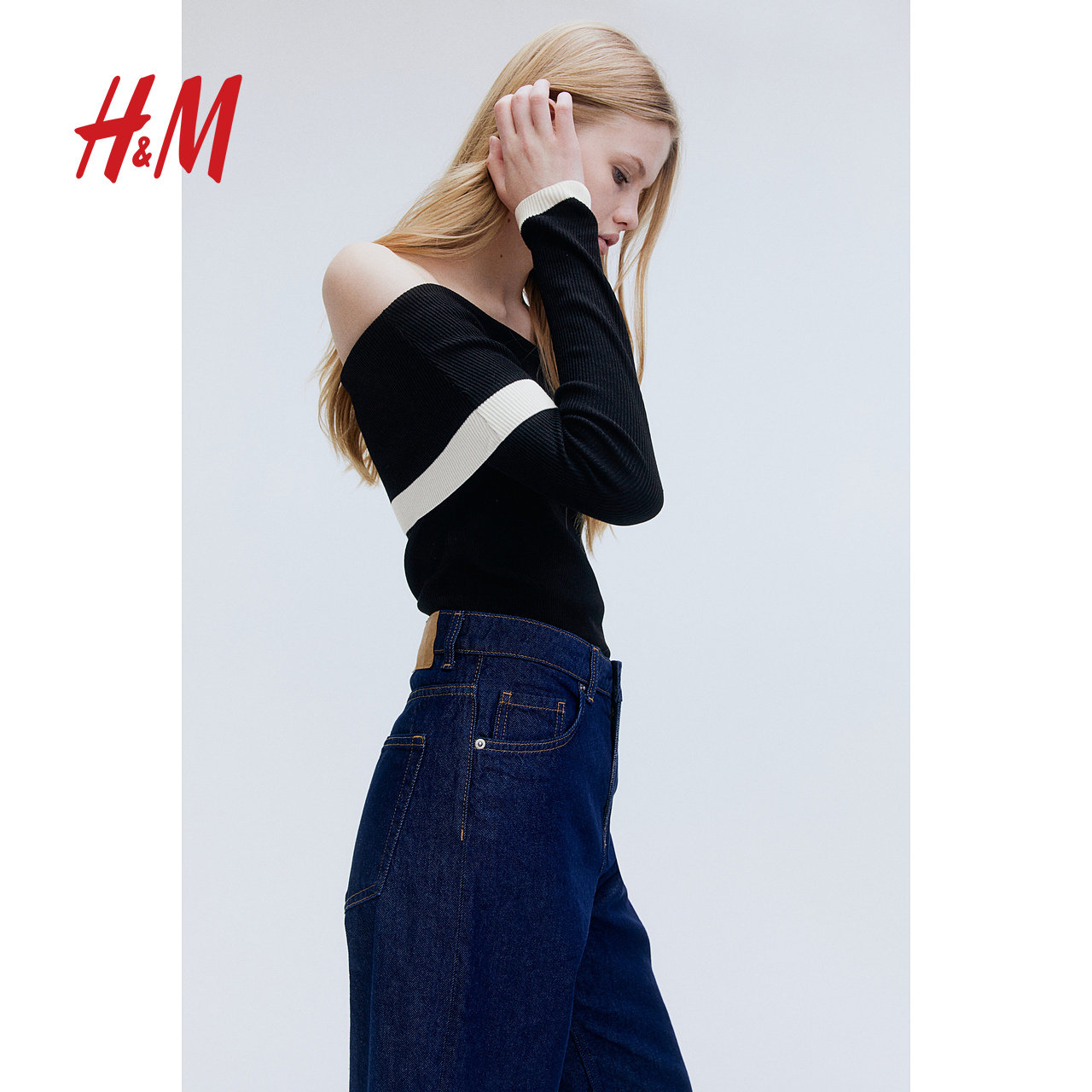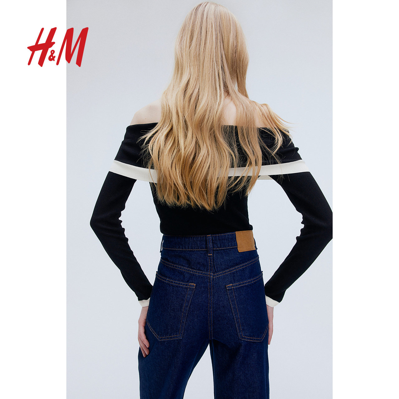 HM女装毛针织衫冬季修身版气质罗纹针织露肩上衣1229925