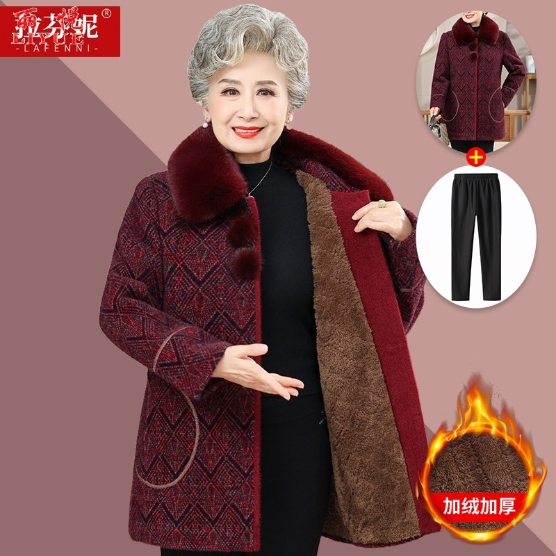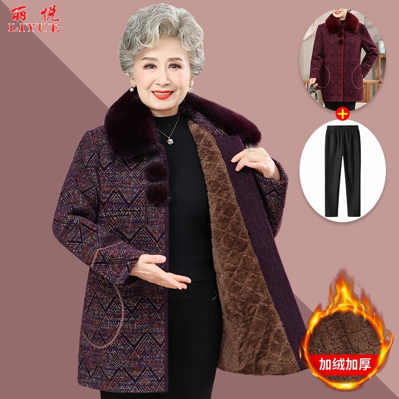 妈妈秋冬季加绒外套女中老年人大码宽松翻领棉衣三层加厚棉服上衣