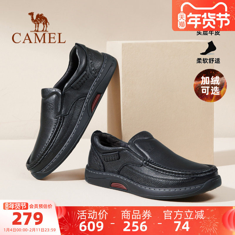 骆驼男鞋2025秋冬新款加绒休闲皮鞋软底46码真皮一脚蹬商务爸爸鞋