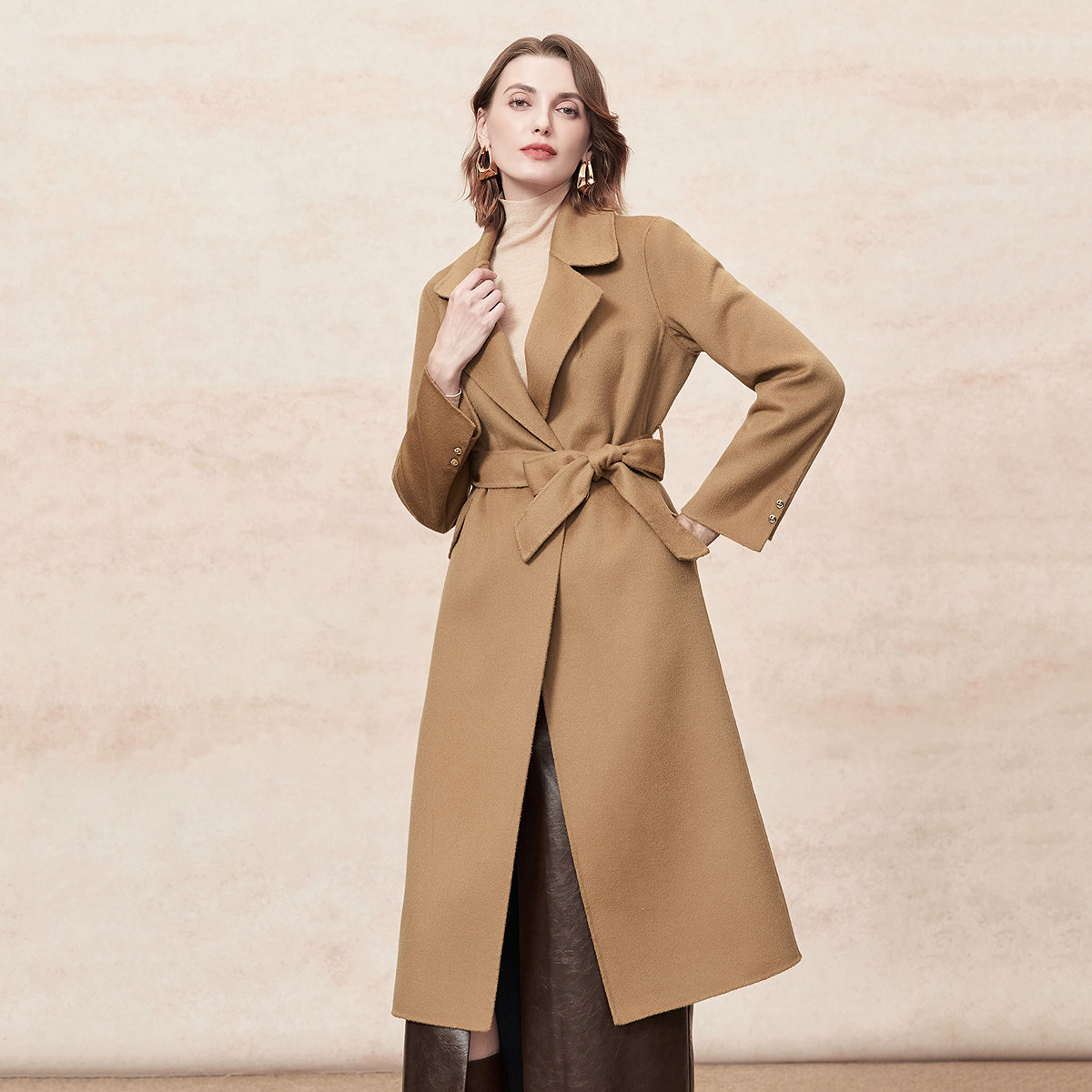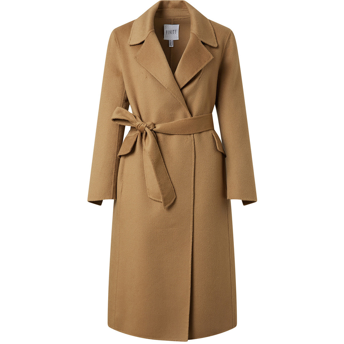 FINITY菲妮迪毛呢外套2025冬季新款简约驼色系带双面呢长款大衣女