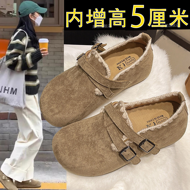 真皮版~加绒内增高勃肯鞋女2025秋冬全包厚底单鞋小个子毛毛鞋子