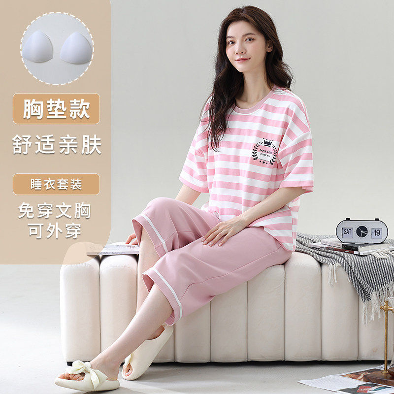 红豆带胸垫睡衣女夏季短袖七分裤卡通可外穿少女加大码宽松家居服