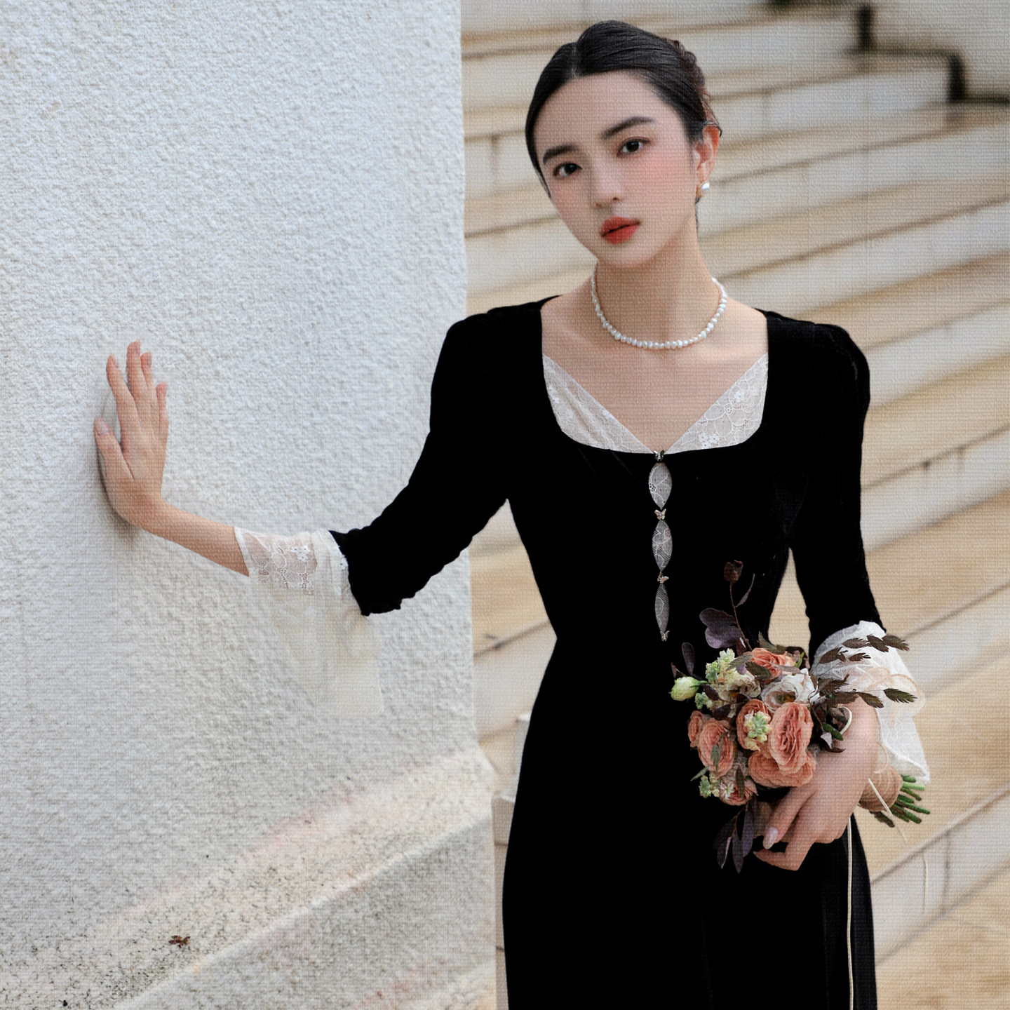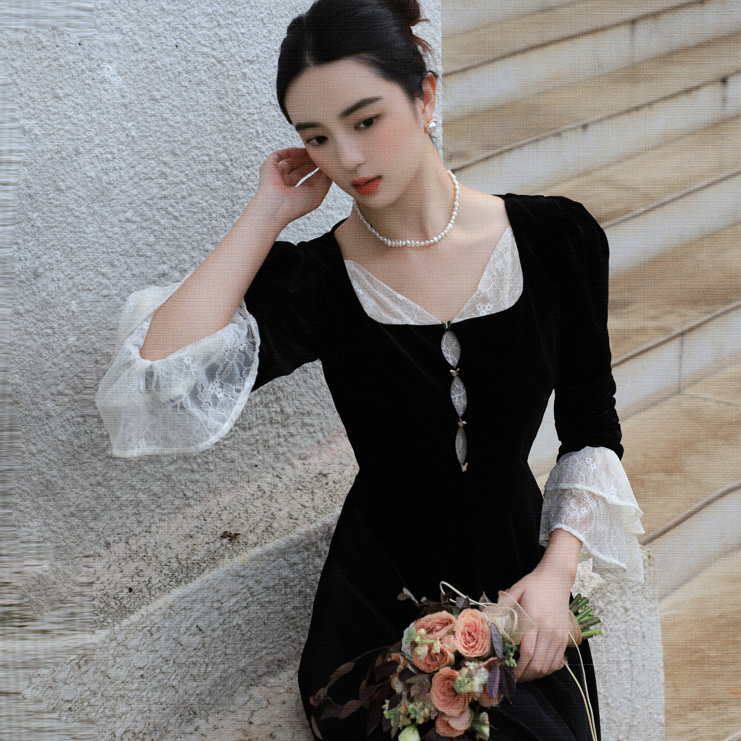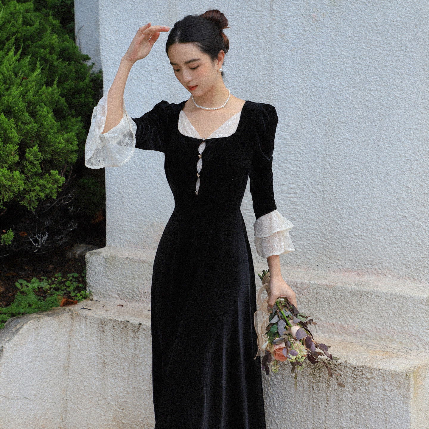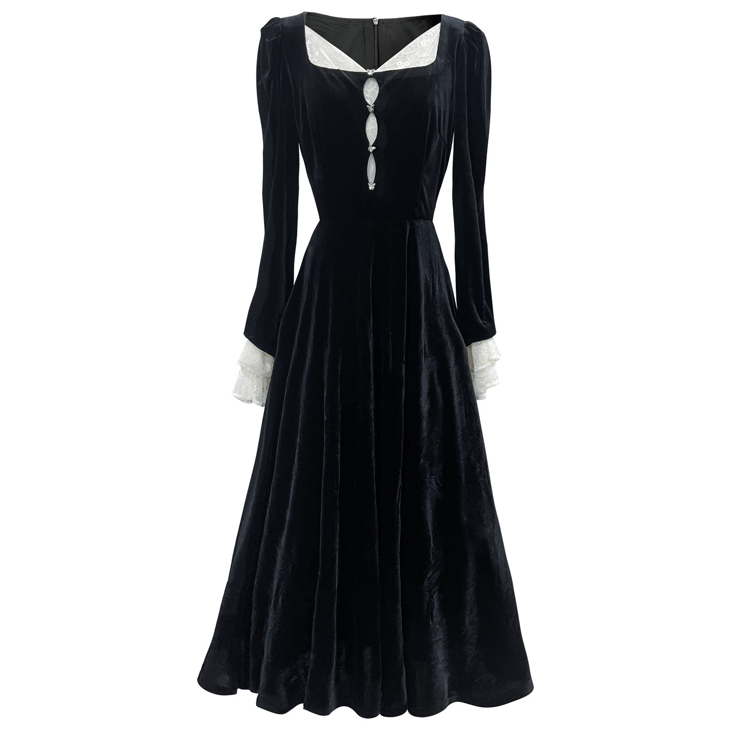 JUJU定制高级感千金风法式宫廷蕾丝撞色丝绒连衣裙女黑色长裙秋季