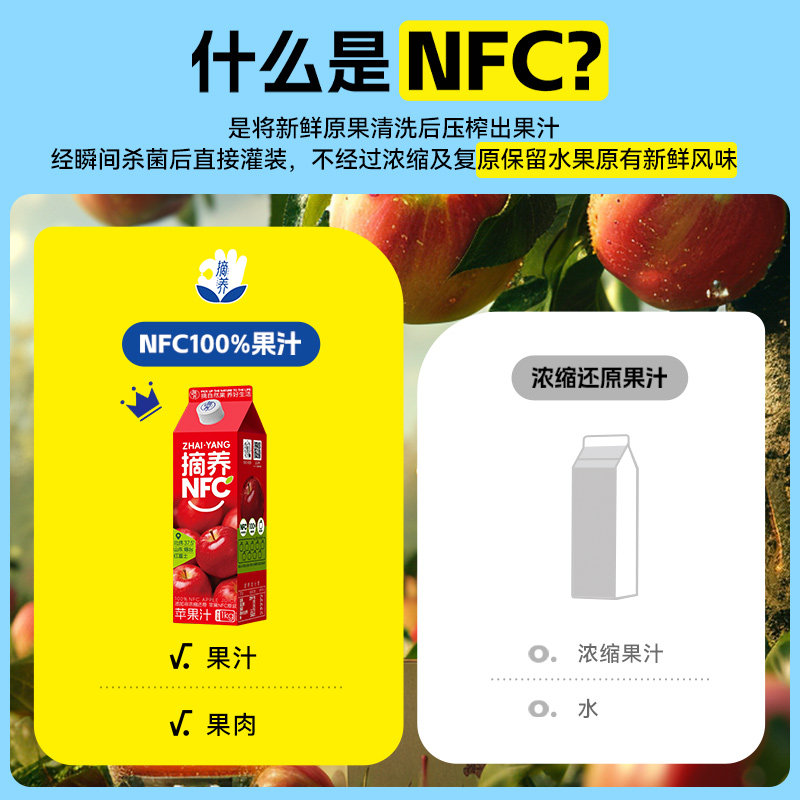 摘养100%NFC纯果汁儿童饮料苹果汁家庭装婚宴请饮品聚餐1kg*4盒装