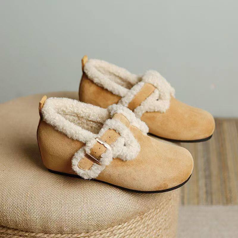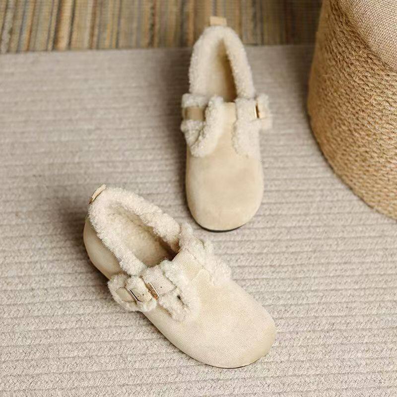 羊皮版复古玛丽珍鞋女方头秋冬季加绒保暖毛毛棉鞋平底晚晚单鞋女