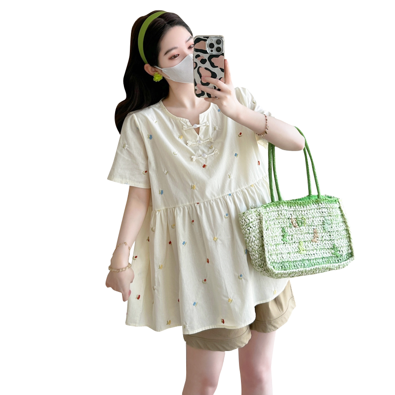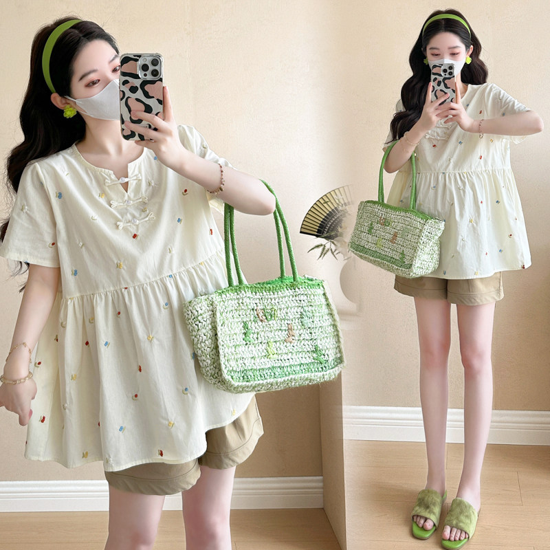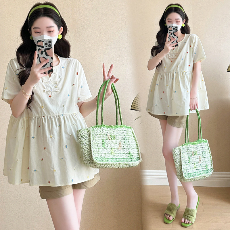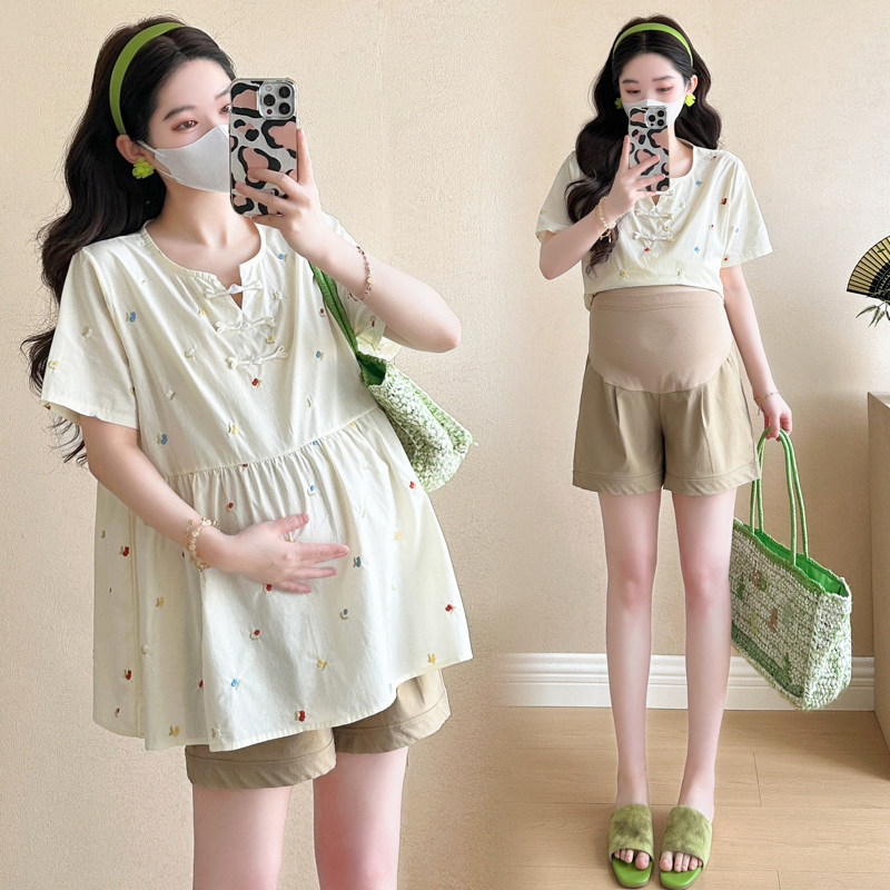 婧麒孕妇上衣套装2026春装新款短袖复古风宽松甜美遮孕肚时尚短裤