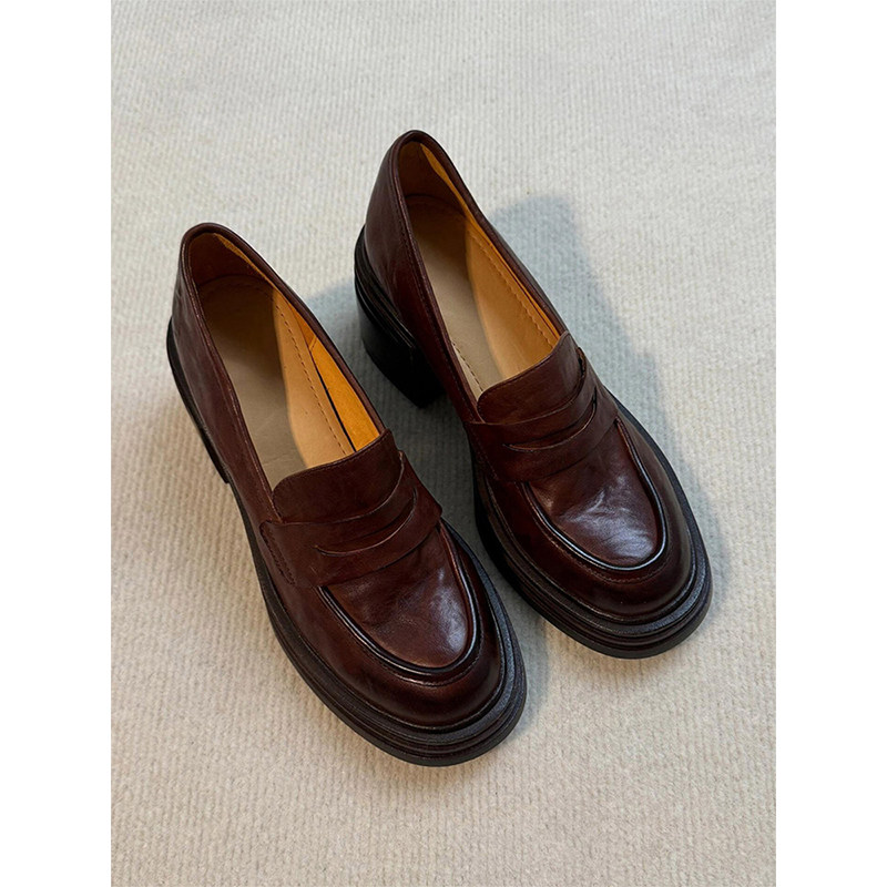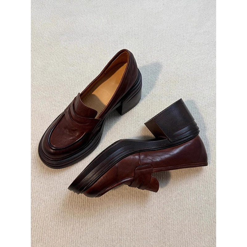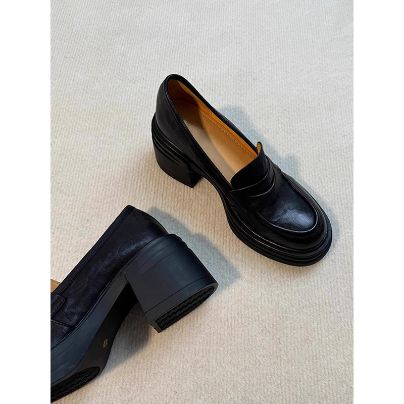 版~厚底粗跟乐福鞋女羊皮小个子增高一脚蹬真皮小皮鞋黑色棕色