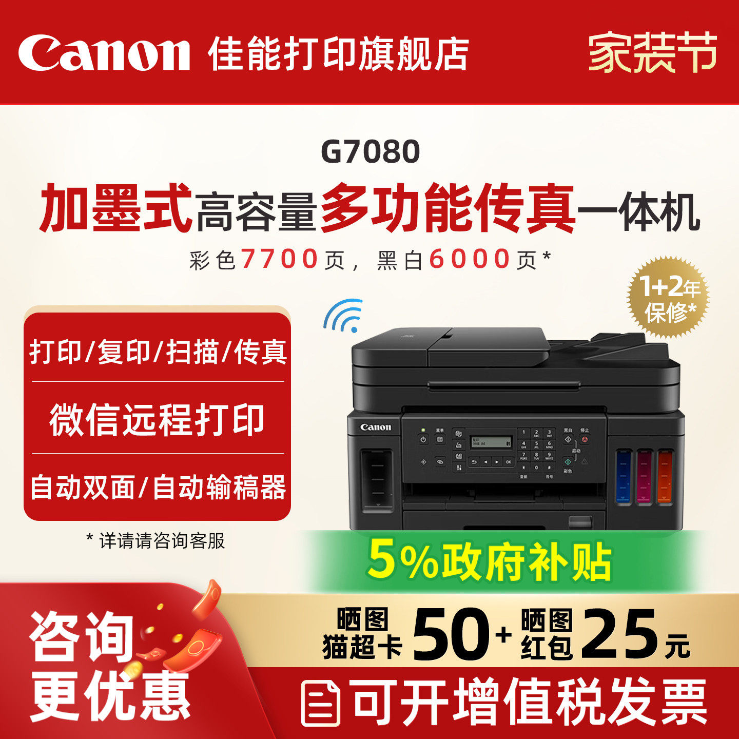 佳能旗舰店G6080/G7080原装加墨彩色A4喷墨打印一体机大印量办公家用打印机照片自动双面手机复印扫描