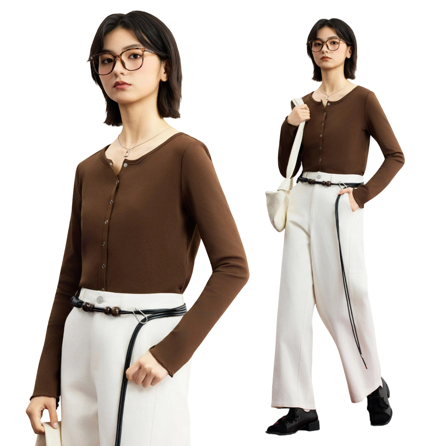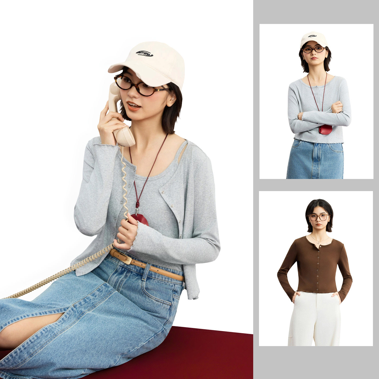 三福长袖上衣2025新款秋季圆领修身针织衫简约纯色内搭打底衫女装