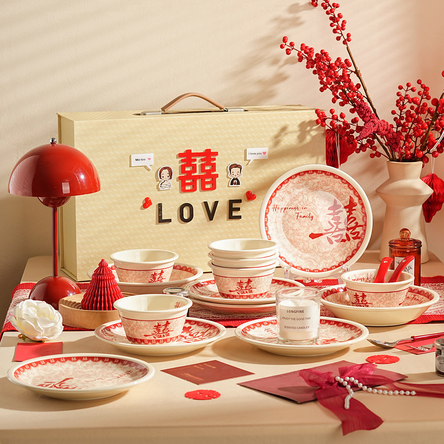 高档碗碟餐具陶瓷新婚礼物送新娘红色碗盘筷套装乔迁新居结婚礼盒