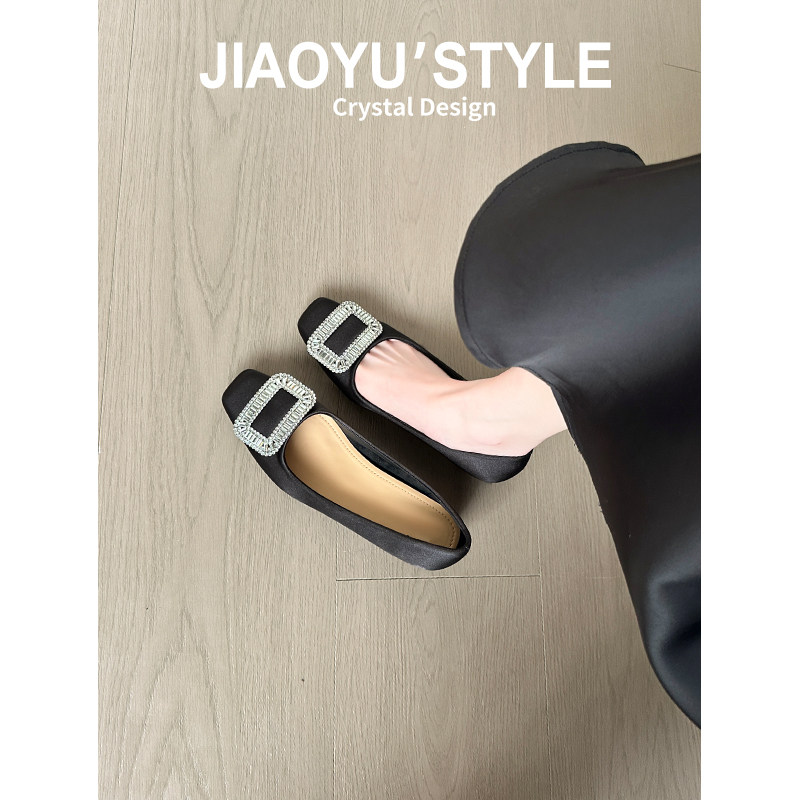 真皮~骄屿方扣水钻玛丽珍鞋方头缎面浅口内增高春季新款通勤单鞋