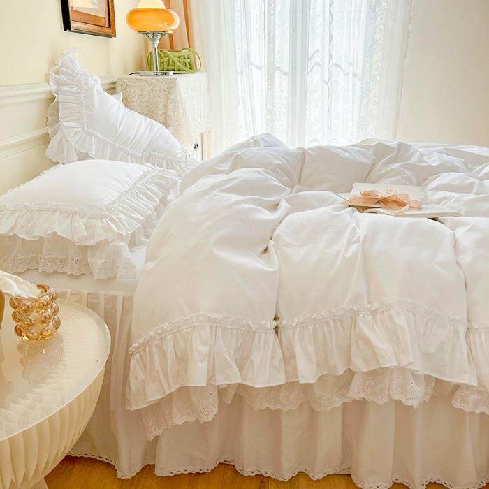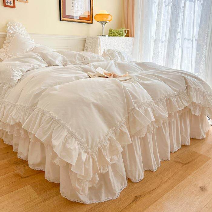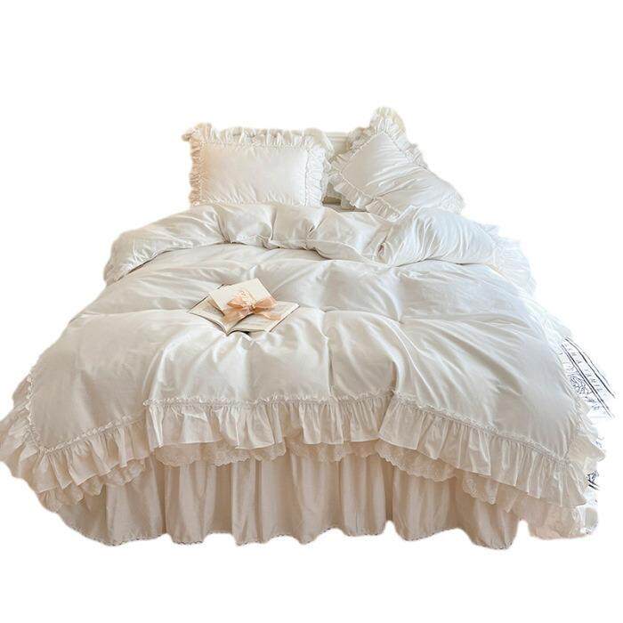 北欧全棉100纯棉白色四件套公主风荷叶边被套蕾丝床裙款4花边款